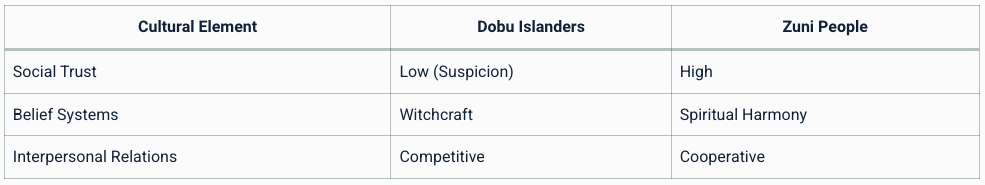| Case Study: The Dobu Islanders Example: The Dobu Islanders of Papua New Guinea were another focus of Benedict’s research. She observed that their culture was based on suspicion, witchcraft beliefs, and competitiveness. Table: Comparison of Dobu and Zuni Cultural Traits ![]()  |