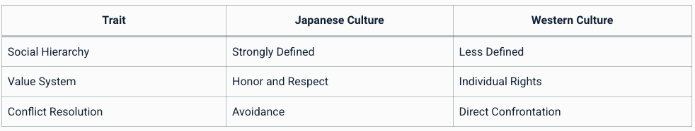 ケーススタディ:日本社会 例:ベネディクトの日本文化に関する研究、特に著書『菊と刀』は、彼女の理論の顕著な応用例です。彼女は、日本文化が名誉、尊敬、階層をどのように重視し、それが日本人の人格形成に影響を与えているかを考察しました。 表:日本文化と西洋文化の特徴 ![]()  |