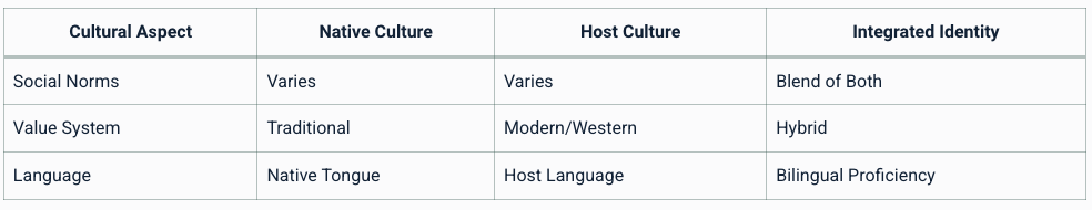 ケーススタディ:現代のグローバル文化 現代の世界では、この理論は文化の同化や多文化アイデンティティの形成を理解するのに役立ちます。例えば、移民が自国の文化の特徴を、受入国の文化とどのように融合させ、折り合いをつけていくかといったことです。 表:多文化アイデンティティの形成 ![]()  |