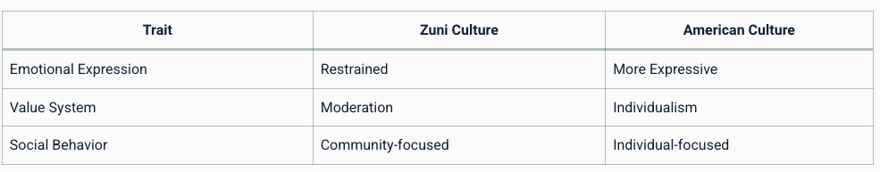 | Case Study: The Zuni People Example: The Zuni, a Native American tribe, were studied by Benedict. She noted their culture emphasized values like moderation, restraint, and a dislike for extreme emotional expressions. Table: Comparison of Zuni and American Personality Traits ![]()  |