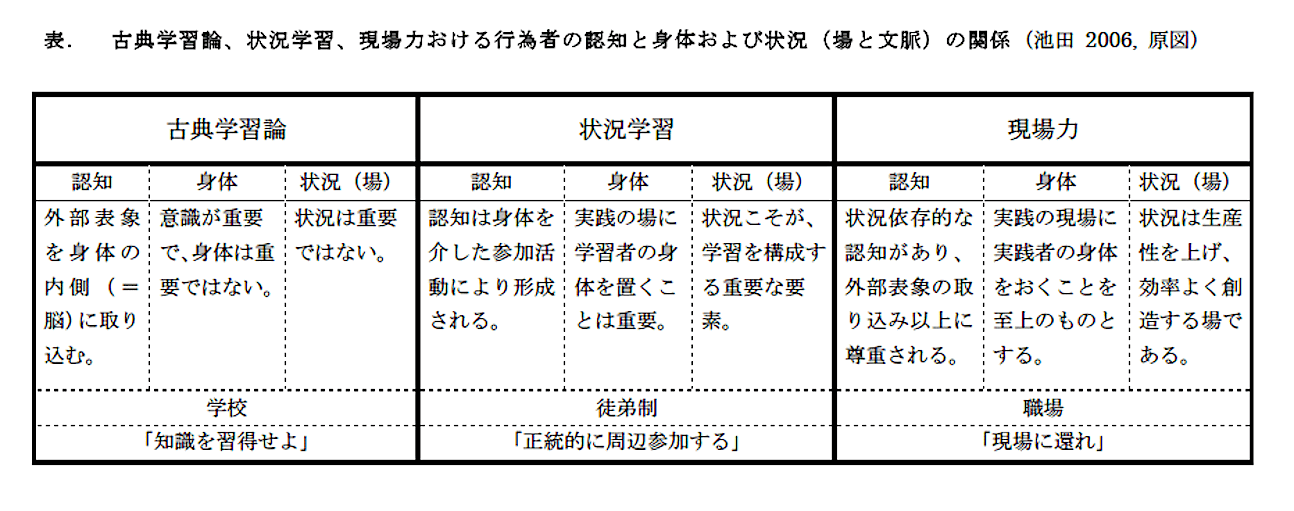 これらの一連のこと(すなわち古典学習論、状況学習、現場力)を、認知、身体、状況(場)の 位置づけに関して、それぞれの特性をあげれば下の表のようになる。