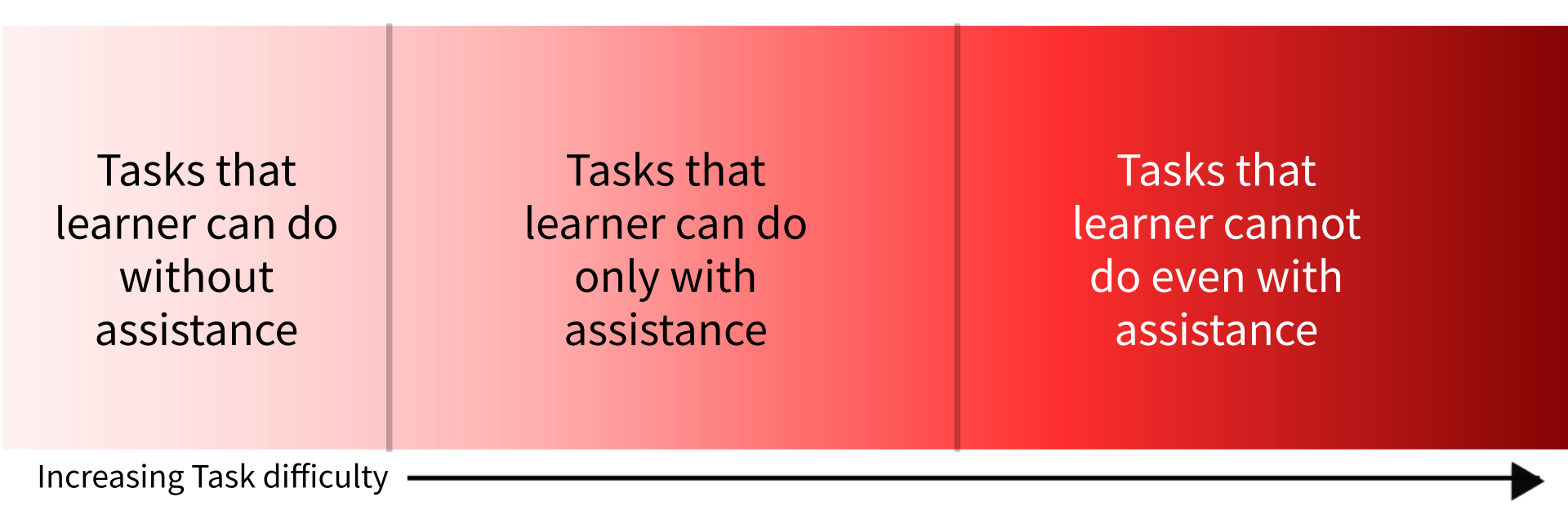 が支援なしに実行可能なことと、支援があっても実行できないことの間の空間を表す。これは学習者が実行できる範囲であるが、より知識や専門性を持つ教師や