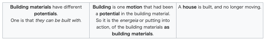 | Building is one motion that had been a potential in the building material. So it is the energeia or putting into action, of the building materials as building materials. |