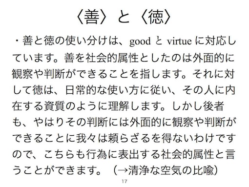 17. 善と徳について、ここで考えてみましょう。 ・善と徳の使い分けは、good と virtue に対応しています。善を社会的属性としたのは外面的に観察や判断ができることを指します。それに対して徳は、日常的な使い方に従い、その人に内在する資質 のように理解します。しかし後者も、やはりその判断には外面的に観察や判断ができることに我々は頼らざるを得ないわけですので、こちらも行為に表出する社 会的属性と言うことができます。(→清浄な空気の比喩) |