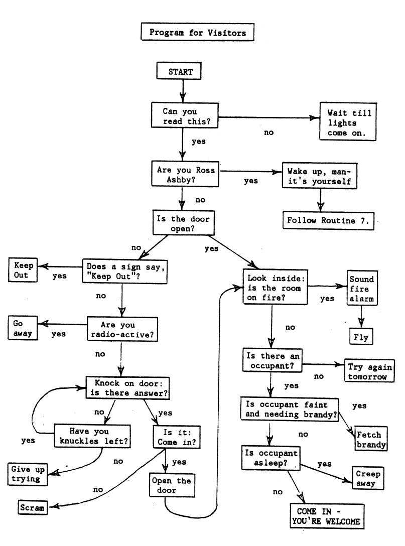 ウィリアム・ロス・アシュビー[William Ross Ashby, 1903-1972]という、サイバネティクス、脳の計算理論、および複雑系に関する先駆的な研究をおこなった先生がいます。その先生の研究室に 貼って あったのか、それとも何かの研究室オリエンテーションで配ったのか(ハンドアウトと説明)よくわかりませんが、おもしろいアルゴリズムがありましたので、 再掲します。ググってみましたが、それに類するようなものがないので、アシュビー先生の生前の人柄を偲ぶものでもあると思いますので、掲載することとしま す。研究者は、これくらいのユーモアがないとあきませんね。(画像をリンクすると、単独で拡大します)
