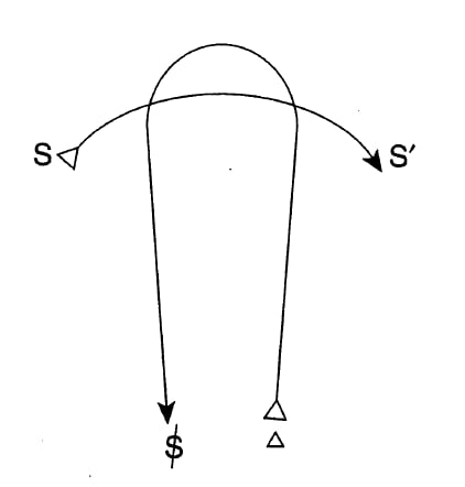 シニフィアンの連鎖(S→S')△はキルト縫いして時間を遡り主体($)を形成する(237-238)・この遡及的意味の決定が、リアルな姿を含めることを成就する——ジュパンチッチ(2003:237-238)