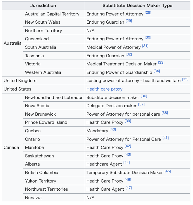 代理意思決定者 詳細な記事: 代理意思決定者 代理意思決定者は、本人が意思決定や意思伝達を行う能力を持たない場合に限り、本人に代わって意思決定を行う。[25] 代理意思決定者を特定する方法はいくつかある。理想的な方法は、法定文書を用いて人格を任命することだ。法定文書がない場合、代理意思決定者は法令に権限 順に記載された「責任者」となる可能性がある。[25] 代理意思決定者は、本人が関連書類を完了した後に自ら選択することも、選択された代理意思決定者がいない場合に法律によって割り当てられることも(例:家 族や介護者)、人格のために任命されることもある(例:後見人審判所によって任命された後見人)。[26] 代理意思決定者は、代替判断または最善の利益という原則に基づいて決定を行う。[2] 代替判断とは、代理意思決定者が人格が望むであろうことを最善に推測して決定を下す場合を指す。この決定は、人格の既知の意思と入手可能な最善の医療助言 の両方に基づいて行われるべきである。[27] 最善の利益に基づく意思決定では、代理意思決定者は患者の最善の利益に焦点を当てる必要がある。 多くの管轄区域では、法定文書による代理意思決定者の選任を支援する法律が存在するが、全てではない。管轄区域によって名称は異なる: ![]() |