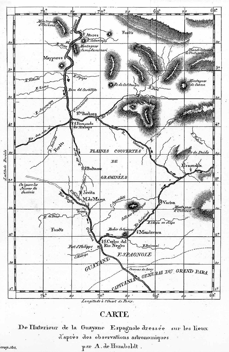 ベネズエラ、1799–1800年![]() フンボルトとエメ・ボンプランはカシキアレ川沿いのアマゾン熱帯雨林にいた。彼らは科学機器を携えており、5年間の旅を通じて様々な正確な測定を行うこと ができた。エドゥアルト・エンダーによる油絵、1856年。フンボルトはこの絵を好まなかった。描かれた機器が不正確だったからだ。[55] ![]() フンボルトの1799年観測に基づくカシキアレ水路図 スペイン国王の許可を得たフンボルトとボンプランは、1799年6月5日にア・コルーニャからピサロ号で急ぎ出航した。船はテネリフェ島で6日間停泊し、フンボルトはテイデ火山に登頂した後、新大陸へ向けて航海を続け、7月16日にベネズエラのクマナに上陸した。 当初の目的地はクマナではなかったが、船内で発生した腸チフスにより、船長はハバナから南米北部に寄港するコースを変更した。フンボルトは具体的な探検計 画を立てていなかったため、この変更は固定された旅程を覆すものではなかった。彼は後に、ベネズエラへの迂回がオリノコ川沿いの探検を可能にし、ポルトガ ル領ブラジル国境まで到達できたと記している。この迂回航路で、ピサロ号は18人のグアヤキ族インディアンを乗せた大型丸木舟2隻と遭遇した。ピサロ号の 船長は、そのうちの1人が案内役として同行する申し出を受け入れた。フンボルトはこのインディアン、カルロス・デル・ピノをガイドとして雇った。[56] 16世紀から18世紀にかけてのベネズエラは、ニュー・エスパーニャ(メキシコ)やペルーに本拠を置くスペイン副王領の中心地と比べると、比較的辺境の地 であった。しかしブルボン改革期に、スペイン領南アメリカの北部は行政的に再編され、1777年にはカラカスを本拠とする総督府が設置された。この新管轄 区域に関する膨大な情報はフランソワ・ド・ポンズによって既にまとめられていたが、出版されたのは1806年になってからだった。[49][57] フンボルトは行政の中心地カラカスを記述する代わりに、砂糖、コーヒー、カカオ、綿花といった輸出作物が栽培されていたアラグア渓谷から研究を始めた。カ カオ農園は最も収益性が高く、世界的なチョコレート需要の高まりを受けていた[58]。フンボルトが人為的気候変動の概念をここで発展させたとされる。同 地にあるバレンシア湖の水位急落の証拠を調査したフンボルトは、樹木の伐採と露出した土壌の保水力不足が干上がりの原因だと結論づけた。農耕民による森林 の伐採は、気温を調節する森林の「三つの」影響、すなわち冷却効果のある日陰、蒸発、放射を排除していたのである。[59] フンボルトはカリペの宣教所を訪れ、グアチャロ洞窟を探検した。そこで彼はオイルバードを発見し、後に科学界にステアトルニス・カリペンシスとして知られ るようにした。またグアノコ瀝青湖を「善き司祭の泉」(Quelle des guten Priesters)と記述した[60][61]。クマナに戻ったフンボルトは11月11日から12日にかけての夜、驚くべき流星群(レオニッド流星群) を観測した。ボンプランと共にカラカスへ進み、アビラ山に登った。同行したのは若き詩人アンドレス・ベジョで、彼は後に南米北部の独立指導者となるシモ ン・ボリバルの家庭教師を務めていた。フンボルトは1804年にパリでベネズエラのボリバル本人と出会い、ローマで共に過ごした。記録によれば、フンボル トがボリバルに独立闘争への参加を促したという推測は裏付けられないが、ボリバルがフンボルトのスペイン領アメリカに関する新たな知見の創出を称賛してい たことは示されている。[62] 1800年2月、フンボルトとボンプランはオリノコ川とその支流の探検を目的に海岸を離れた。この旅は4か月間続き、1,725マイル(2,776キロ メートル)に及ぶ未開でほとんど無人地帯を横断し、カシキアレ水路(オリノコ川とアマゾン川の流域を結ぶ水路)の存在を確認することを目的としていた。フ ンボルトは知らなかったが、この存在は数十年前に既に確認されていた[63]。しかし彼の探検は、分岐点の正確な位置を特定した[23]こと、マイプレ族 やその滅んだ敵対部族アトゥレ族など複数の先住民の生活を記録した点で重要な成果をもたらした(後者の部族の言葉の数語は、フンボルトに1羽のオウムに よって伝えられた[64])。1800年3月19日頃、フンボルトとボンプランは危険な電気ウナギを発見した。その放電は人を殺すほどだった。捕獲のた め、現地人は野生の馬を川に追い込むよう提案した。これによりウナギが泥底から現れ、ウナギと馬の激しい衝突が発生し、馬数頭が死亡した。フンボルトとボ ンプランは数匹のウナギを捕獲し解剖したが、それらは依然として電気ショックを与える能力を保持していた。調査中、両者とも危険な電気ショックを受ける可 能性があった。この遭遇はフンボルトに電気と磁気について深く考えさせるきっかけとなった。これは彼の観察からより一般的な原理へと推論する能力の典型例 である[65]。フンボルトは後年の著作、旅行記『個人旅行記