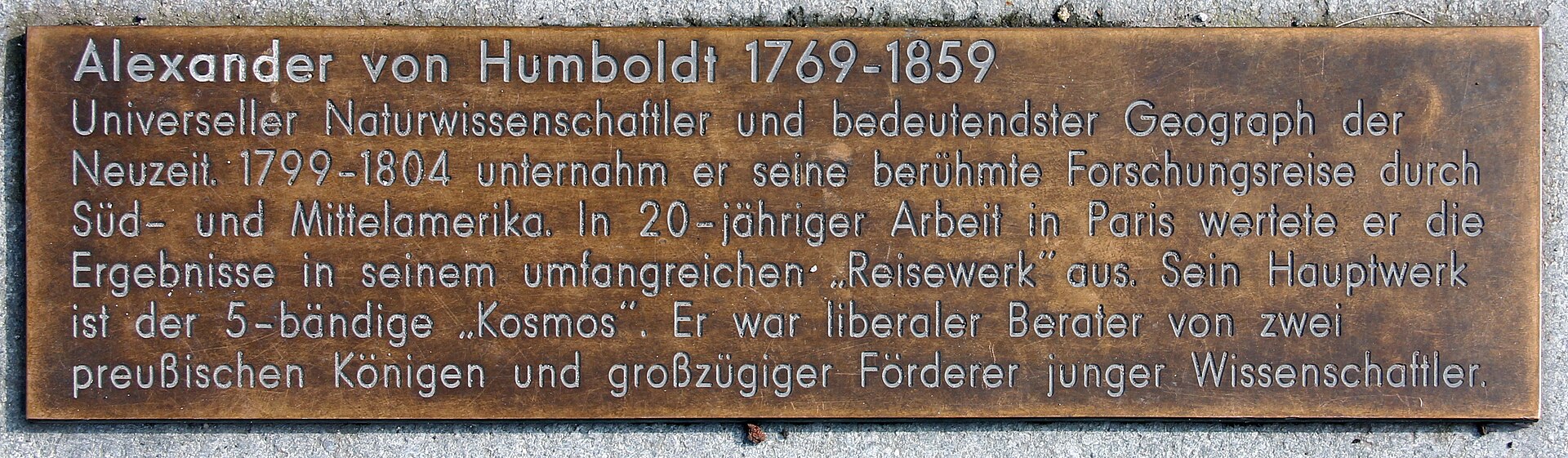 フンボルトに因んで名付けられた場所 以下の場所はフンボルトに因んで名付けられている: ハシエンダ・フンボルト、チワワ州、メキシコ フンボルト、サウスダコタ州、アメリカ合衆国 フンボルト、ネブラスカ州、アメリカ合衆国 フンボルト、イリノイ州、アメリカ合衆国 フンボルト、アイオワ州、アメリカ合衆国 フンボルト、テネシー州、アメリカ合衆国 フンボルト、カンザス州、アメリカ合衆国 フンボルト、ミネソタ州、アメリカ合衆国 米国アリゾナ州ハンボルト 米国カリフォルニア州ハンボルト郡 米国カリフォルニア州ユーレカにあるフォート・ハンボルト州立歴史公園 米国ネバダ州ハンボルト郡 米国アイオワ州ハンボルト郡 カナダサスカチュワン州ハンボルト ハンボルト公園、シカゴ、イリノイ州、アメリカ合衆国 アレハンドロ・デ・ハンボルト国立公園、キューバ アレクサンダー・フォン・ハンボルト国有林、ペルー ハンボルト・トイヤベ国有林、ネバダ州およびカリフォルニア州、アメリカ合衆国 ハンボルト公園、バッファロー、ニューヨーク州、アメリカ合衆国 ハンボルト・パークウェイ、バッファロー、ニューヨーク州、アメリカ合衆国 天文学的特徴 ハンボルト海(月の海) 54 アレクサンドラ (小惑星) 4877 フンボルト (小惑星) 地質学的対象 鉱物フンボルトは、1821年にマリアーノ・デ・リベロによってアレクサンダーにちなんで名付けられた。 大学、カレッジ、学校 フンボルト大学ベルリン 大学 フンボルト大学ベルリンは、アレクサンダーと、その兄弟であるウィリアムにちなんで名付けられた。[251] コロンビア、ボゴタおよびビジャ・デ・レイバにあるアレクサンダー・フォン・フンボルト生物資源研究所 カリフォルニア州アーカタにあるカリフォルニア州立工科大学ハンボルト校 ベネズエラ、カラカスにあるアレハンドロ・デ・フンボルト大学 学校 主な記事:アレクサンダー・フォン・フンボルトにちなんで名付けられた学校のリスト アレクサンダー・フォン・フンボルト・ギムナジウム、ドイツ、コンスタンツ アレクサンダー・フォン・フンボルト・ジャーマン・インターナショナル・スクール・モントリオール、カナダ、モントリオール アレクサンダー・フォン・フンボルト・コレジオ・アレマン、メキシコ、メキシコシティ アレクサンダー・フォン・フンボルト・ドイチェ・シューレ・リマ、ペルー、リマ アレクサンダー・フォン・フンボルト・コレジオ、ベネズエ ハンボルト高校、ミネソタ州セントポール 講演シリーズ アレクサンダー・フォン・フンボルトは、オランダの人文地理学における著名な講演シリーズ(ラドバウド大学ナイメーヘンが主催)にもその名を残している。これは、ハイデルベルク大学で広く知られる毎年恒例のヘットナー講演に相当するオランダ版のものだ。 アレクサンダー・フォン・フンボルト財団 フンボルトの死後、彼の友人や同僚たちは、若い学者たちへの彼の寛大な支援を継続するために、アレクサンダー・フォン・フンボルト財団(ドイツ語で Stiftung)を設立した。当初の基金は、1920年代のドイツのハイパーインフレと、第二次世界大戦の結果として失われたが、ドイツ政府によって再 設立され、海外の若手学者や著名な上級学者に授与されている。この財団は、外国の研究者をドイツに招き、ドイツの研究者が一定期間海外で研究活動を行うこ とを可能にする上で重要な役割を果たしている。 献辞 エドガー・アラン・ポーは、最後の主要作品『ユーレカ:散文詩』をフンボルトに「深い敬意を込めて」捧げた。フンボルトが『コスモス』で科学の統一を試みたことは、ポーのプロジェクトに大きな影響を与えた。 2019年、ホセフィーナ・ベネデッティは、5つの楽章からなるオーケストラ組曲「フンボルト」を作曲した。 船 アレクサンダー・フォン・フンボルトは、この科学者にちなんで名付けられたドイツの船でもある。1906年にブレーメンのドイツ造船所AG Weserによって、Reserve Sonderburgとして建造された。1986年に退役するまで、北海とバルト海全域で運用されていた。その後、ドイツの造船所モーターヴェルケ・ブ レーマーハーフェンによって三本マストのバーク船に改造され、1988年にアレクサンダー・フォン・フンボルトとして再就航した。 ヤン・デ・ヌル・グループは、1998年に建造されたホッパー式浚渫船を運航しており、これもアレクサンダー・フォン・フンボルトと名付けられている。 同時代の人々による評価 シモン・ボリバルは、「南アメリカの真の発見者はフンボルトである。彼の業績は、あらゆる征服者たちの業績よりも、我々の民にとってより有用であった」と 記している。[253] チャールズ・ダーウィンは、フンボルトへの感謝と彼の業績への賞賛を表明し[254]、ジョセフ・ダルトン・フッカーに、フンボルトは「史上最高の科学旅 行者」であると書簡で伝えている。[255] ヴィルヘルム・フォン・フンボルトは、「アレクサンダー