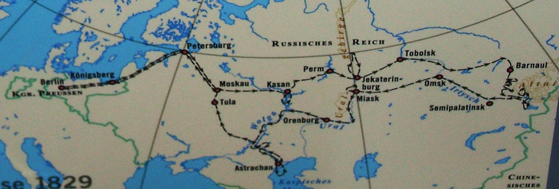 ロシア遠征、1829年![]() 1829年フンボルトのロシア遠征地図 1811年、そして1818年にも、アジア探検計画がフンボルトに提案された。最初は皇帝ニコライ1世のロシア政府から、その後プロイセン政府からであっ た。しかしその度に、不都合な事情が介入した。彼が科学の利益のために旅人としての初期の役割を再開したのは、60歳を迎えてからであった。 ロシア財務大臣ゲオルク・フォン・カンクリン伯爵は、ロシアにおけるプラチナ通貨の可能性についてフンボルトに問い合わせ、ウラル山脈訪問を招待した。世 界通貨として銀が標準だった当時、フンボルトはプラチナ通貨に前向きではなかった。しかしウラル訪問の招待は興味深いものだった。特にフンボルトが長年ア ジア行きを夢見ていたからだ。彼はインドへの渡航を望み、イギリス東インド会社に旅行許可を得るよう相当な努力を重ねたが、その努力は実を結ばなかった。 [146] ロシアがフンボルトへの以前の招待を再提示した際、彼はこれを受け入れた。[147] ロシア側は、フンボルトの鉱山地帯への持続的な関心を誘引材料とした。フンボルトにとっては比較科学研究の目的であったが、ロシア側にとっては自国の資源 に関する専門知識を得るためであった。フンボルトにとって、ロシア皇帝が旅費を負担すると約束したことは極めて重要だった。なぜなら、彼が相続した10万 ターラーの財産は尽き、プロイセン政府から宮廷侍従として支給される年2500~3000ターラーの年金で生活していたからだ。ロシア政府はベルリンで 1200チェルヴォンツェフを前払いし、サンクトペテルブルク到着時にさらに2万を支給した[148]。 フンボルトはウラル山脈だけでなく、シベリアの草原を越えてロシアと中国の国境まで旅することを熱望していた。彼はカンスリン宛ての手紙で、鉱業雑誌を読 むためにロシア語を習得するつもりだと記している。[149] 遠征の詳細が決まるにつれ、フンボルトは自身のフランス製馬車とドイツ人従者、さらに化学・鉱物学教授グスタフ・ローゼを伴ってロシアへ向かうと述べた。 またクリスティアン・ゴットフリート・エーレンベルクを遠征に招き、バイカル湖とカスピ海の水生微生物を研究させる計画も立てた。フンボルト自身は山岳と 鉱床の磁気研究を継続することに強い意欲を持っていた。彼の研究では常として、最も正確な測定を行うための科学機器を持参した。[150] ロシア側は宿泊施設、馬、随行要員を含む現地手配を組織した。フンボルトの遠征における肩書は鉱山省の役人であった。遠征が危険地域に近づくにつれ、護衛 付きの護送隊で移動せざるを得なかった。[148] フンボルトは高齢にもかかわらず体調は良好で、カンクリン宛ての手紙に「白髪混じりの老齢にもかかわらず、今も9~10時間休みなく軽やかに歩き回っている」と記している。[151] ![]() 1959年ソビエト連邦発行切手 1829年5月から11月にかけ、拡大を続ける探検隊はネヴァ川からエニセイ川までロシア帝国の広大な領域を横断し、25週間で9,614マイル (15,472キロメートル)の距離を移動した。フンボルトと隊員たちは整備された道路を馬車で移動し、中継地点での馬の交換により迅速な進捗が実現され た。一行はさらに増員され、狩猟師兼動物標本収集家のヨハン・ザイフェルト、ロシアの鉱山官吏、パリ時代の友人アドルフ・ポリエ伯爵、調理人、そして警備 のためのコサック部隊が加わった。三台の馬車には人員、物資、科学機器が詰め込まれた。フンボルトの磁気測定を正確に行うため、鉄分を含まないテントが携 行された[152]。この探検は、ボンプランと二人きりで現地ガイドを伴うこともあったスペイン領アメリカでの旅とは異なっていた。ロシア政府は、フンボ ルトが鉱業や国家の商業発展の可能性を探ることに興味を示し、社会問題の調査やロシア農奴の社会状況への批判は禁じることを明確にした。スペイン領アメリ カに関する著作では、先住民の生活状況について言及し、黒人奴隷制を嘆いたが、それは現地を離れた後のことだった[153]。フンボルトが知ったように、 政府は遠征隊を厳しく管理しており、モスクワから1,000マイル(1,600km)離れた地点でも、各停留地で地方政府の役人が出迎えた。旅程はトボリ スクを最遠の目的地とし、その後サンクトペテルブルクへ戻る計画だった。 フンボルトはロシアのカンクリン大臣に旅行延長の書簡を送った。その書簡が計画を阻止できる時期に届くことはないと承知の上での行動だった。東へ進むほど 荒れ地が広がるが、フンボルトはその旅路をますます楽しんだ。一行は依然としてシベリア街道を進み、1日に100マイル(160キロ)も進むなど順調だっ た[154]。7月末に炭疽菌の発生を警告され進路を阻まれたが、フンボルトは危険を顧みず継続を決断した。「この年頃になって、何も先延ばしにするべき ではない」と。[155] この旅はロシア政府の直接的な後援によるあらゆる利点を享受して行われたものの、科学的に有益と言え