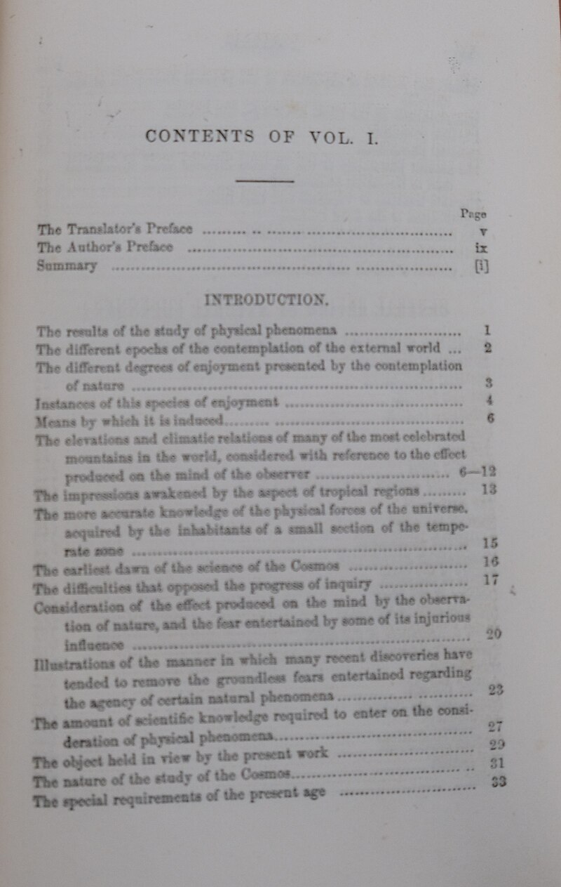 著作 コスモス 関連項目: コスモス (フンボルトの著作) ![]() 晩年のフンボルトの写真 コスモスは、フンボルトが晩年に取り組んだ多巻にわたる著作であり、長年の研究の成果を総括するものであった。この著作は、1827年から1828年の冬 にかけてベルリン大学で行った講義を基に形作られた。これらの講義は「[K]osmosという巨大なフレスコ画の下絵」となるはずだった[162]。 1829年のロシア遠征は、ラテンアメリカ遠征と比較可能なデータを提供した[163]。 『コスモス』の最初の2巻は1845年から1847年の間に刊行され、全巻を網羅する予定であったが、フンボルトはさらに3巻を刊行し、うち1巻は死後出 版された。フンボルトはかねてより地理学と自然科学に関する包括的な著作を執筆することを目指していた。この著作は、当時知られていた科学をカント的な枠 組みで統合しようとする試みであった。ドイツ・ロマン主義に触発され、フンボルトは世界の環境に関する大要の編纂を目指した[14]。彼は長寿の生涯の最 後の10年——自らが「ありえない年」と呼んだ時期——をこの作業に費やした。第3巻と第4巻は1850年から58年に刊行され、第5巻の一部は1862 年に遺稿として出版された。 彼の評判は、スペイン領アメリカ探検に関する著作によってとっくに確立されていた。『コスモス』の重要性については意見が分かれている。『新スペイン王国 に関する政治論考』を必読の書として重要視するある学者は、『コスモス』を「学術的な珍品に過ぎない」と一蹴している[164]。一方で『コスモス』こそ が彼の「最も影響力のある著作」だったとする見解もある[163]。 ![]() 『コスモス』第1巻目次表の初版(エリゼ・オッテ訳、1849年) 『コスモス』第1巻目次表の初版(エリゼ・オッテ訳、1849年) フンボルトの他の著作と同様、「コスモス」も複数の言語に翻訳されたが、その品質はまちまちであった。英国と米国では非常に人気があった。1849年、ド イツの新聞は、英国では3つの翻訳のうち2つが女性によって行われているのに対し、「ドイツではほとんどの男性が理解していない」と報じている。 [165] オーガスティン・プリッチャードによる最初の翻訳(1845年に第1巻、1848年に第2巻がベイリエール社から匿名で出版)は、急いで作成されたため質 が劣っていた。フンボルトは手紙の中で、この翻訳について「私の評判を傷つけるだろう。私の記述の魅力をすべて、サンスクリット語のように聞こえる英語が 台無しにしている」と述べている。[要出典] 他の 2 つの翻訳は、エリザベス・ジュリアナ・リーヴス・サバインが夫のエドワード・サバイン大佐の監督のもとで(1846 年から 1858 年にかけて 4 巻)、そしてエリーゼ・オッテが(1849 年から 1858 年にかけて 5 巻、4 巻のドイツ語版を完全に翻訳した唯一の翻訳)行った。これら 3 つの翻訳も米国で出版された。巻の番号は、ドイツ語版と英語版で異なっている。ドイツ語版の巻3は、英語訳の巻3と巻4に対応する。ドイツ語版は1850 年と1851年に2部構成で刊行されたためである。ドイツ語版の 5 巻は、1981 年になってようやく、再び女性によって翻訳された。オッテの翻訳は、詳細な目次と全巻の索引が役立った。ドイツ語版では 4 巻と 5 巻にのみ(非常に短い)目次があり、全巻の索引は 1862 年の 5 巻で初めて掲載された。ドイツではあまり知られていないが、ドイツ語版『コスモス』に付属するアトラス「ベルクハウスの物理アトラス」は、トラウゴット・ ブロムによる海賊版「アレクサンダー・フォン・フンボルトのコスモスに関するアトラス」(シュトゥットガルト、1861年)としてよく知られている。 英国では、ハインリッヒ・ベルクハウスがアレクサンダー・キース・ジョンストンと共同で「物理アトラス」を出版する計画を立てていた。しかし、後にジョン ストンは「自然現象の物理アトラス」というタイトルで単独で出版した。英国では、このアトラスが『コスモス』と関連があることは認識されていなかったよう だ。  |