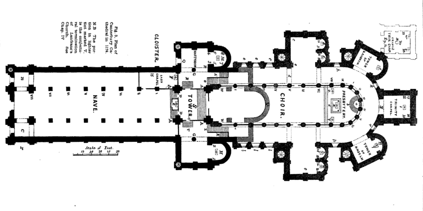同じ日、ウィリアム2世はついに司教座の領地を返還した。[51] 8世紀半ばから、大司教は教皇自身が授けた、あるいは送った羊毛のパリオなしでは叙階されないという慣習が定着していた。[54] アンセルムスはこの目的のためにローマへ旅立つことを主張したが、ウィリアムはそれを許可しなかった. 叙任権論争の最中、教皇グレゴリウス7世と皇帝ハインリヒ4世は互いに二度ずつ廃位した。ハインリヒに忠実な司教たちは最終的にラヴェンナ大司教ギベール を第二の教皇として選出。フランスではフィリップ1世がグレゴリウスとその後継者ヴィクトル3世、ウルバヌス2世を承認したが、ギベール(「クレメンス3 世」として)は1084年以降ローマを掌握した。[55] ウィリアムはどちらの側にも付かず、自らの選択以前にイングランドの臣民がどちらの教皇も承認することを阻止する権利を保持していた。[56] 結局、12月4日にアンセルムスを大司教に叙任する式典が、パリオ(教皇の象徴)なしで執り行われた。[51] カンタベリー大司教 大主教としてアンセルムスは、管理責任、慎重さ、適切な指導、祈りと瞑想といった修道院の理想を堅持した。[57] アンセルムスはカンタベリーの改革と利益を擁護した。[58] そのため、彼は改革計画への支援をイングランド王室に繰り返し迫った。[59] 一方、カトリック教会に対する王権の特権への原則的な反対は、二度も彼をイングランドからの追放へと導いた。[60] 歴史家たちの従来の見解は、アンセルムスを教皇庁と結託して世俗権力に対抗した人物と位置づけ、彼の在任期間を教皇グレゴリウス7世と皇帝ハインリヒ4世 によって始まった叙任権争いのイングランドにおける舞台と見なしてきた. [60] 生涯の終わりまでに、彼はカンタベリーをイングランド王の支配から解放し[61]、反抗的なヨーク[62]とウェールズの司教たちの服従を教皇に認めさ せ、アイルランドの司教たちに対する強い権威を獲得するなど、成功を収めた。しかしカンタベリーとヨークの争いが最終的に決着する前に死去し、教皇ホノリ ウス2世は結局ヨークを支持する判断を下した。[64] ![]() エルヌルフとコンラートの拡張後のカンタベリー大聖堂[65] 工事の大部分はクライストチャーチの修道院長エルヌルフ(1096–1107)とコンラート(1108–1126)によって進められたが、アンセルムス司 教在任中には、ランフランクの当初の計画からカンタベリー大聖堂が拡張された。[66] 東端は解体され、広大で装飾豊かな地下聖堂の上に拡張された聖歌隊席が設けられ、大聖堂の長さは倍増した。[67] 新たな聖歌隊席は独立した教会を形成し、独自の翼廊と三つの礼拝堂に通じる半円形の回廊を備えていた。[68] |