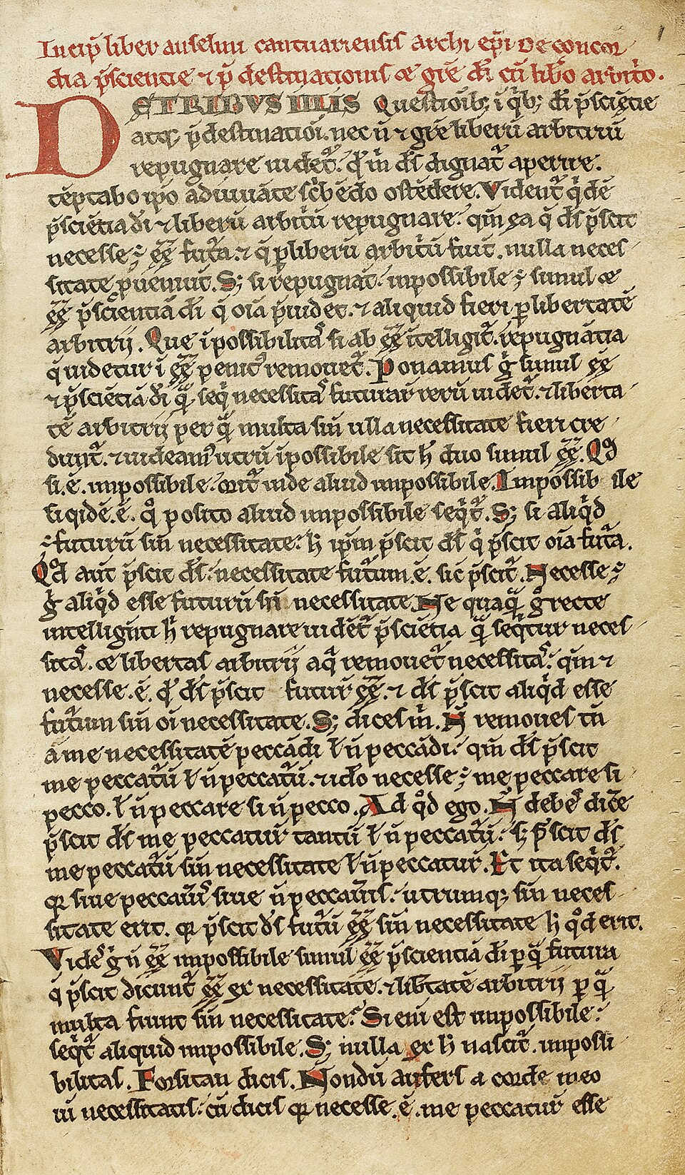 ![]() 『一致について』の12世紀写本の最初のページ その他の著作 アンセルムスの『三位一体の信仰と聖言の受肉について、ルゼリヌスの冒涜に対する論駁』 (『三位一体の信仰と御言葉の受肉について、ルゼリーニの冒涜に対する論駁』)[38]、別名『御言葉の受肉に関する書簡集』(Epistolae de Incarnatione Verbi)[29]は、1092年と1094年の二度にわたり草稿が作成された。[38] この書簡は、ランフランクとアンセルムスを、コンピエーニュのロズェランが主張したとされる三神論的異端との関連から擁護するとともに、三位一体論と普遍 概念を支持する論拠を提示した。 『処女の受胎と原罪について』(De Conceptu Virginali et de Originali Peccato)は1099年に書かれた[29]。彼は、教え子であり友人であるボソのために『神はなぜ人となったのか』の一側面を補足したいという思い からこれを書いたと主張し、アンセルムスがボソとの対話の半分を担う形式を取っている。[148] アンセルムススはマリアの無原罪の御宿りへの信仰を否定した[197]が、彼の思想はその教義発展の基盤となる二つの原理を打ち立てた。第一に、マリアは 神を除けば想像しうる最も純粋な存在であるべきだという点だ。第二に、原罪の扱い方である。以前の神学者たちは、原罪が性行為の罪深い性質によって世代か ら世代へ伝播されると主張していた。アンセルムスは、以前の著作と同様に、アダムの罪は堕落の際に生じた人間性の変化を通じて子孫に受け継がれたと主張し た。親は、自分たちが一度も持ったことのない正義の性質を子供に確立することはできなかったのだ[198]。この問題は後に、マリア自身の誕生を取り巻く 教義によって、マリアの場合において扱われることになる。 『聖霊の流出について、ギリシア人に対する』(De Processione Spiritus Sancti Contra Graecos)[164]は1102年に書かれた[29]。これはバーリ公会議におけるアンセルムスによる主題論の要約である[90]。彼はまず、人間 は神そのものからではなく類推によってのみ神を知ることができると述べ、三位一体論を論じた。彼が用いた類推は人間の自己意識である。意識、記憶、知性と いう特異な二重性が父と子の関係を象徴する。これら二者(記憶と知性)の相互愛は、両者の関係から生じるものであり、聖霊を象徴するのだ[157]。 『予知と予定と神の恩寵と自由意志の調和について』(De Concordia Praescientiae et Praedestinationis et Gratiae Dei cum Libero Arbitrio)は1107年から1108年にかけて執筆された[29]。『処女の懐胎について』(De Conceptu Virginali)と同様、対話形式で単一の語り手が、反対側の立場から想定される異議を提示する形式を取っている[148]。自由意志に関する論述は アンセルムススの先行著作に依拠しつつ、神の属性によって生じる実際の矛盾やパラドックスが存在しない点についてより詳細に論じている。[149] 第5章では『独白』における永遠性の考察を再展開する。「そこには現在に存在するもの以外は何もないが、それは我々の時間的な現在ではなく、あらゆる時間 を包含する永遠の現在である。ある意味で、現在という時があらゆる場所とあらゆる場所にある全てのものを包含するように、同様に、あらゆる時は永遠の現在 の中に包含され、あらゆる時に存在する全てのものが含まれるのだ。」[200] これは包括的な現在であり、神によって同時に全てが把握される。それゆえ、神の「予知」と人類の真の自由選択の両方が可能となるのである。[201] アンセルムススが死の床で未完のまま残した著作の断片が現在も残っている。これは能力/無能力、可能性/不可能性、必然性/自由といった対立概念のペアに ついて論じた対話形式の著作であったと考えられる。[202] そのため、この著作は『能力と無能力、可能性と不可能性、必然性と自由について』(De Potestate et Impotentia, Possibilitate et Impossibilitate, Necessitate et Libertate)という名称で引用されることもある。[38] もう一つの著作は、おそらくアンセルムスによって未完のまま残され、その後改訂・拡大された『De Humanis Moribus per Similitudines』(「類推を通して語られる人類の道徳について」)あるいは『De Similitudinibus』(「類推について」)である。[203] 彼の格言集(Dicta Anselmi)は、おそらく修道士アレクサンダーによって編集された。[204] また、彼はさまざまな聖人への祈りも作成した。[17] アンセルムスは、聖職者、修道士、親族などに対して、500通近くの現存する手紙(Epistolae)を書いた。[205] 最も古いものは、1070年にランフランクに従ってイングランドに渡ったノーマンの修道士たち宛てに書かれたものである。[17] サザンは、アンセルムスの手紙は「最も親密な」ものさえも、彼の宗教的信念の表明であり、多くの人々に読まれることを意識して書かれたものであると主張し ている。[206] ドイツのナウムベルク司教ヴァルトラムへの長い手紙(Epistolae ad Walerannum)『De Sacrificio Azymi et Fermentati(無酵の犠牲と発酵の犠牲について)』と『De Sacramentis Ecclesiae(教会の秘跡について)』は、いずれも 1106 