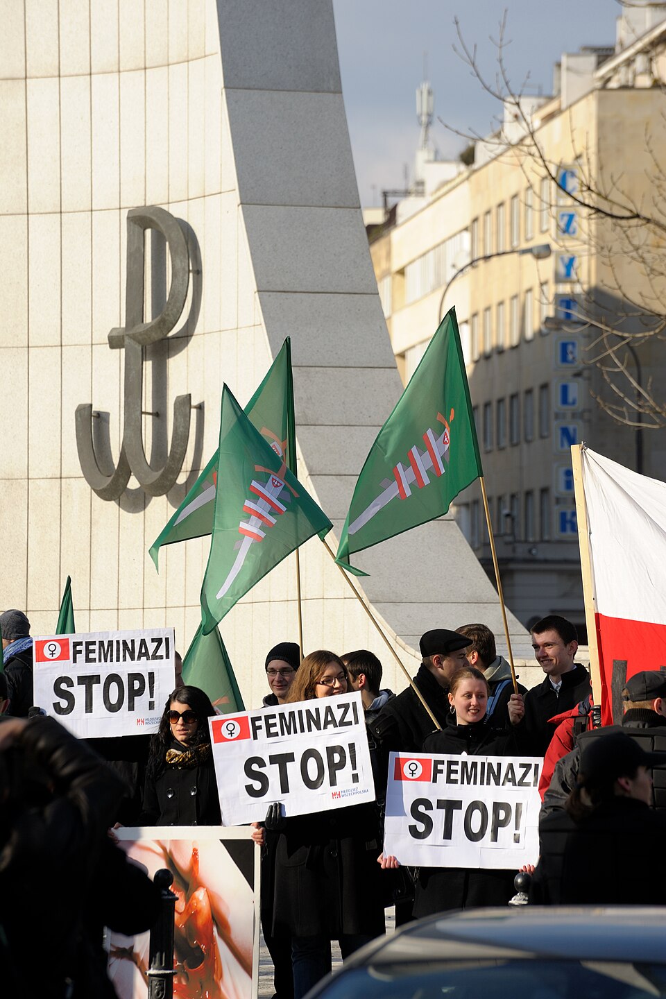 21st century![]() A group of Polish ultranationalists protest an International Women's Day march in Warsaw, 2010 Some current antifeminist practices can be traced back to the rise of the Christian right in the late 1970s.[12] Antifeminist internet communities and hashtags include men's rights activists, incels ("involuntary celibates"), pickup artists, "meninism", "Red Pill", #YourSlipisShowing, #gamergate, and Men Going Their Own Way (MGTOW). These communities overlap with various white supremacist, authoritarian, and populist movements.[55] In 2014, users of the social media hashtag #WomenAgainstFeminism argued that feminism demonizes men (See Misandry) and that women are not oppressed in 21st century Western countries.[22][56][57][58] A meta-analysis in 2023 published in the journal Psychology of Women Quarterly investigated the stereotype of feminists' attitudes to men and concluded that feminist views of men were no different to that of non-feminists or men towards men and titled the phenomenon the misandry myth – "We term the focal stereotype the misandry myth in light of the evidence that it is false and widespread, and discuss its implications for the movement."[59] Many scholars consider the men's rights movement a backlash[9] or countermovement[10] to feminism. The men's rights movement generally incorporates points of view that reject feminist and profeminist ideas.[60][61] Men's rights activists say feminism has radicalized its objective and harmed men.[61][62][63][64] Men's rights activists believe that men are victims of feminism and "feminizing" influences in society,[65] and that entities such as public institutions now discriminate against men.[66][62] The website Jezebel has also reported on an increasing number of women and female celebrities rejecting feminism and instead subscribing to humanism.[67] In response to the social media trend, modern day feminists also began to upload similar pictures to websites such as Twitter and Tumblr. Most used the same hashtag, "womenagainstfeminism", but instead made satirical and bluntly parodic comments.[68] In November 2014, Time magazine included "feminist" on its annual list of proposed banished words. After initially receiving the majority of votes (51%), a Time editor apologized for including the word in the poll and removed it from the results.[69][70] |