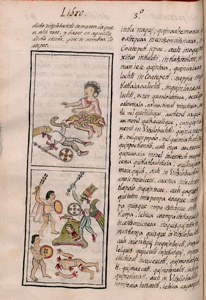 現地調査 メキシコで起こった初期の大量改宗の熱狂が収まった後、フランシスコ会の宣教師たちは、自分たちの仕事を効果的に進めるためには、先住民についてより深く 理解する必要があることに気づいた。サアグンは、1558年にニュースペインの新しい地方長官であるフラ・フランシスコ・デ・トラルから、宣教師プロジェ クトに役立つと思われるテーマについてナワトル語で執筆するよう依頼されたことで、人生が一変した。管区長はサアグンに、先住民の言語と文化の研究を正式 なものとし、それを他の人と共有することを望んでいた。司祭は自由に調査を行うことができた[14]。彼は約25年にわたって研究を行い、最後の15年ほ どは編集、翻訳、コピー作業に費やした。彼の現地調査活動は、前期(1558年~1561年)と後期(1561年~1575年)に分けられる[23]。 ![]() フィレンツェ写本に描かれたアステカの戦士たち。 初期の調査から、サアグンは『プリメロス・メモリアレス』として知られるテキストを執筆した。これは、後に彼が執筆したより大規模な『一般史』の基礎と なった[24]。彼はメキシコシティの北東約50マイル、現在のイダルゴ州に近いテペアプルコで調査を行った。そこで彼は、トラテロルコの大学を卒業した 現地人の協力を得て、ナワトル語でおよそ12人の村の年長者に2年間インタビューした。サハグンは、年長者たちに宗教儀式や暦、家族、経済、政治の習慣、 自然史について質問した。彼は彼らを個別に、またグループでインタビューし、それによって共有された情報の信頼性を評価することができた。彼の助手たちは 3つの言語(ナワトル語、ラテン語、スペイン語)を話した。彼らは研究と文書化、翻訳と通訳に参加し、またイラストも描いた。彼は彼らの名前を公表し、彼 らの仕事を説明し、彼らに功績を与えた。プリメロス・メモリアレス』の挿絵は、先住民とヨーロッパの芸術的要素と影響が融合したものである[25]。サア グンがこの時期に研究活動を行ったことについての分析から、彼はこの情報を収集し検証するための独自の方法を開発し、評価していたことがわかる[23]。 1561年から1575年の間、サアグンはトラテロルコに戻った。彼はさらに多くの長老や文化の権威者にインタビューし、相談した。彼は以前の著作を編集 した。彼は以前の研究の範囲を広げ、インタビュー方法をさらに発展させた。そして、中世の百科事典のスタイルに沿ってプロジェクトを再構築した。これらは 現代的な意味での百科事典ではなく、世界に関する知識を比較的完全に提供しようとするものであるため、世界書(worldbook)と呼ぶ方がふさわし い。 |