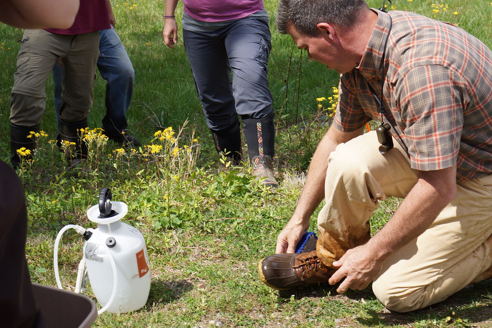 Animals and plants![]() A biologist washing his boots to avoid contaminating a site with invasive species Threats to animals and plants, in particular food crops, which may in turn threaten human health, are typically overseen by a government department of agriculture.[11][12] Animal biosecurity encompasses different means of prevention and containment of disease agents in a specific area. A critical element in animal biosecurity is biocontainment – the control of disease agents already present in a particular area and work to prevent transmission.[13] Animal biosecurity may protect organisms from infectious agents or noninfectious agents such as toxins or pollutants, and can be executed in areas as large as a nation or as small as a local farm.[14] Animal biosecurity takes into account the epidemiological triad for disease occurrence: the individual host, the disease, and the environment in contributing to disease susceptibility. It aims to improve nonspecific immunity of the host to resist the introduction of an agent, or limit the risk that an agent will be sustained in an environment at adequate levels. Biocontainment works to improve specific immunity towards already present pathogens.[15] The aquaculture industry is also vulnerable to pathogenic organisms, including fungal, bacterial, or viral infections which can affect fish at different stages of their life cycle.[16] |
