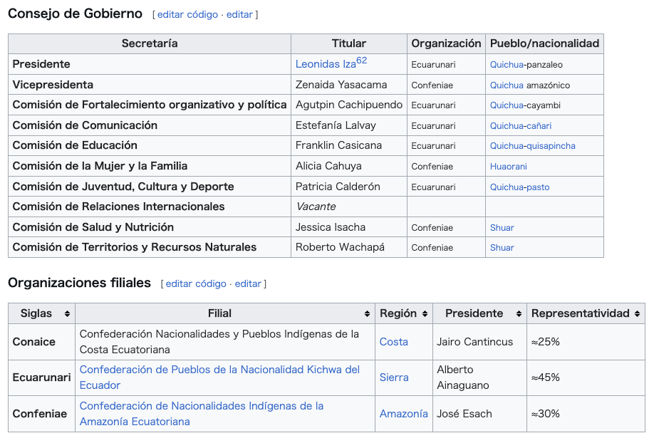 組織 CONAIEは以下の先住民を代表する:シュアル族、アチュアル族、シオナ族、セコヤ族、コファン族、ワオラニ族、ザパロ族、チャチ族、ツァチラ族、アワ 族、エペラ族、マンタ族、ワンカビルカ族、キチュア族。[7] CONAIEは1986年、二つの先住民族連合の統合により設立された。東部アマゾン地域の「エクアドル・アマゾン先住民族連合(CONFENIAE)」 と、中央山岳地域の「ケチュア民族連合 (ECUARUNARI)」である。[8][4] |