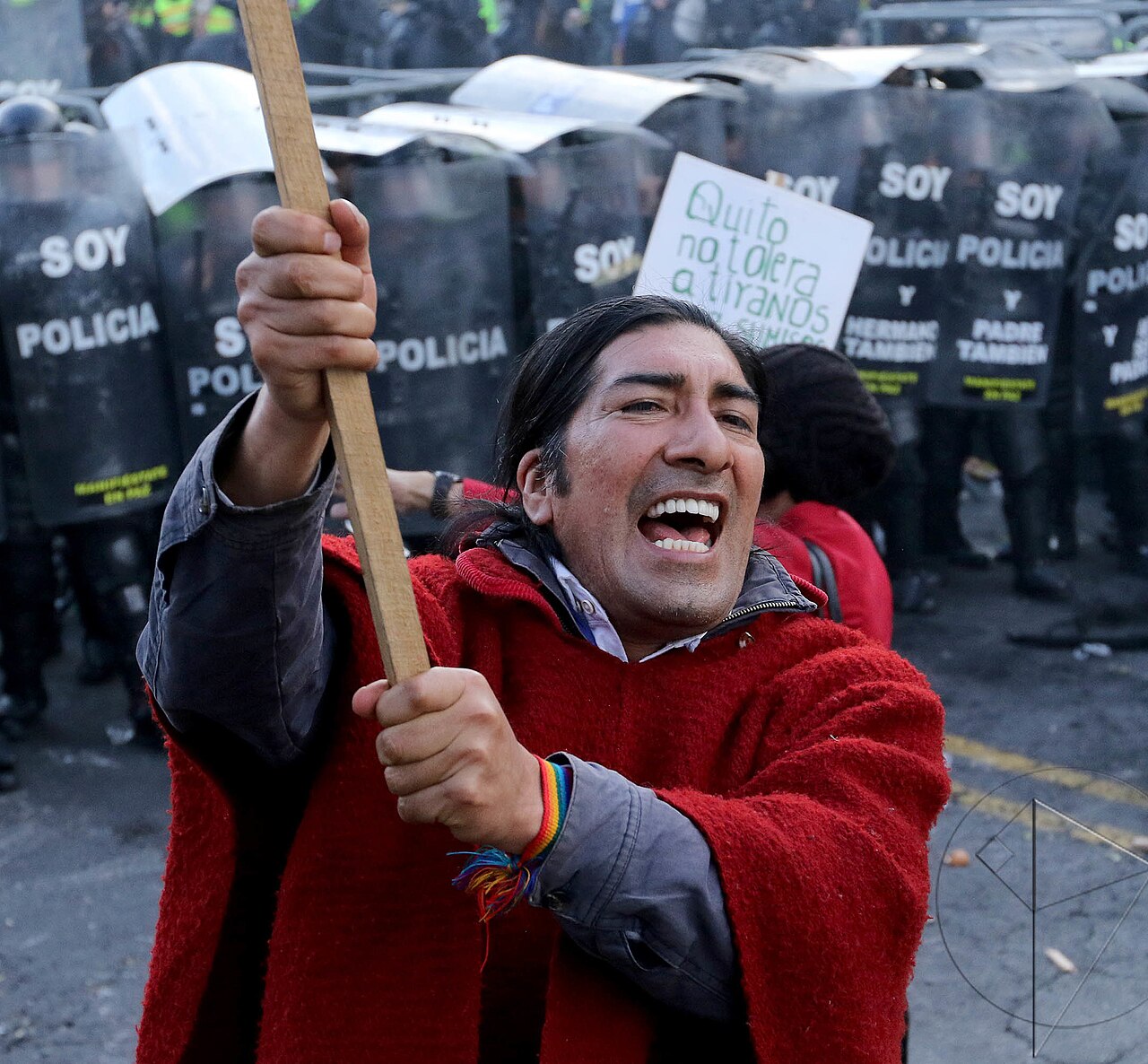 2015年 これらの段落は2015年のエクアドル抗議運動からの抜粋である。[編集] 2015年のエクアドル抗議運動は、ラファエル・コレア大統領の政府に対する一連の抗議活動であった。抗議は6月の第1週に始まり、相続税とキャピタルゲ イン税を引き上げる法案が引き金となった。[19] 8月までに、農村労働者、CONAIEなどの先住民連合、学生団体、労働組合の連合が組織した抗議活動には数十万人が参加し、物議を醸した税制改正、大統 領の任期制限を撤廃する憲法改正、石油・鉱業プロジェクトの拡大、水資源・教育・労働政策、欧州連合との自由貿易協定案、言論の自由に対する弾圧の強化な ど、幅広い不満が表明された。[20][21][22] 8月15日、政府は軍による抗議活動弾圧を可能とする非常事態宣言を発令した。 抗議者らは8月に道路封鎖とゼネストを実施。武装警察と抗議者との衝突で暴力行為や人権侵害が報告された。[22][23] [24] 抗議者らは、コレア大統領が「ベネズエラ政府と同じ道を歩もうとしている」と主張し、「犯罪的な階級戦争」を引き起こしていると述べた。一方、コレア大統 領は、抗議活動は政府を不安定化させることを目的としており、提案された措置は不平等と戦うためのものだと述べた。[25] |