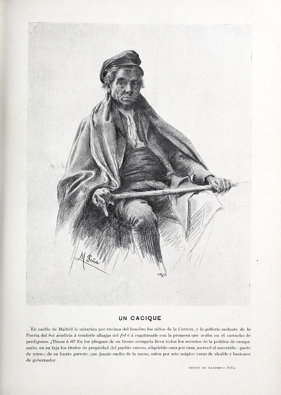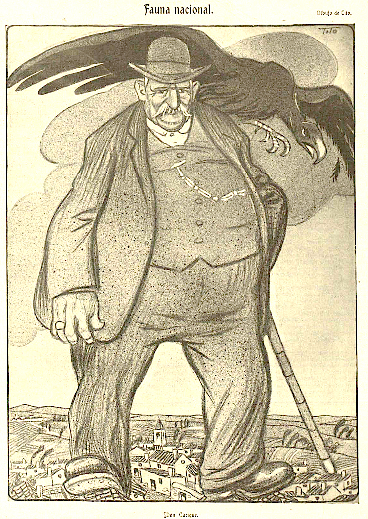 機能 カシークは、当時の政治家と同様、個人的な腐敗に満ちていることは稀だ。彼らは通常、汚職を通じて私利を図ることはない。むしろ、腐敗はシステムの構造に内在しており、国家とその資源は寡頭政治層に奉仕する。カシークはその重要な構成要素である。[39] 通常、公的な地位を持たず、権力者でもないカシークの中心的な役割は、行政とあらゆる社会階層に広がる広範な顧客層との仲介者となることだ。彼らは「カ シーク主義は違法行為によって成り立つ」ため、顧客の利益を違法な手段で満たすことを一貫して追求する。カシークは仲介者として、機能不全の国家と物理 的・象徴的に隔絶された構成員との間の欠落した環として機能する。[21][40] 個別恩恵の受益者には、兵役免除を得る者や課税対象資産の評価額を引き下げられる者がいる。一方、特定の社会経済集団の福祉や、一般大衆(幹線道路、鉄道 踏切、教育機関など)に向けられた利益もあり、その頂点に立つカシケが自らの地位を固める役割を担う。[41] 具体例として、アストゥリアス地方は20世紀初頭、カシケのアレハンドロ・ピダル・イ・モンとその息子ペドロの尽力により、実に豪華な道路網を誇った [39]。同様に、フアン・デ・ラ・シエルバ・イ・ペニャフィエルは1914年にムルシア大学を設立した。[39] 投票箱への不正な票の詰め込み、票のすり替え、死亡者の投票権の悪用といった選挙不正[42]は、通常、カシケによって仕組まれる(プチェラソ)。[1] カシケの影響力は、経済的・行政的・財政的・学術的・医療的資源など多岐にわたる基盤から成り立つ。カシケは、自身に仕える者への取り決めと、圧力・脅 迫・恐喝を含む強制手段によって他者を支配する。彼は職を創出・消滅させ、事業を許可・閉鎖し、地方司法や行政を操作し[43]、兵役義務の免除を得さ せ、地方政治家の利益のために税金を横領し、消費税(consumos)を支払わずに必需品を密かに購入させ[44]、行政手続きを支援し、道路や学校な どの新たなインフラ整備を促進し[40]、自身の資金を貸し出す。彼は無利子で融資を行う。個人的名義でも国家名義でも構わない。返済を急がせることもな い。その寛大さが庶民の感謝を買い、彼に助言を求める民衆は当然ながら選挙でも彼に従うからだ。[21] 地方の政治指導者は、自由党派であれ保守党派であれ、行政決定に影響力を行使する。この影響力は、行政を支配するための違法な手段の使用にまで及ぶ。 [45][46] 指導者が政府の介入から免れるのは、彼らが地元政党のトップであるという地位に由来する。「法律は指導者の支持者の利益のために適用され、反対派には不利 に働く」のである。[47] [48] 「カシークは国家・州・自治体の管轄に属するものを分配する。そして彼は気まぐれに従って分配するのだ。これらの行政機関における地位、建設や事業開設、 職業遂行の許可、あらゆる法的義務の減免や免除。さらに、これら全てを行う権限を持つと同時に、敵を害し、友を救う力も握っているという事実が加わる。」 個人的資産を持つカシケは自らの蓄えから譲歩することもあるが、通常は行政上の便宜を仲介する。故にカシキズムは違法性に依存する[…]。カシケは地域住 民の生活に関わる行政・司法判断の全範囲を、自らの納得する反法的基準で決定させねばならない。」 —ホアキン・ロメロ・マウラ フェリシアーノ・モンテロは、カシケを中央行政と市民の間の仲介者と位置づけ、選挙期間が最もスキャンダラスな時期であるにもかかわらず、その影響力が選 挙期間を超えて及ぶことを指摘している。モンテロは、カシケの影響力が国の政治生活において一貫性を保っていると主張する。カシキズムは主に、日常的な人 間関係においてパトロン・クライアント関係や政治的・行政的繋がりを通じて持続的に現れる社会政治構造の顕現であり、論理的表現である。[49] 復古期において、ある判事はカシキズムを「政治的影響力によって国家の正当な機能を歪め、腐敗させ、特定の個人や集団の私利私欲に従属させるために、村々 (プエブロス)で行使される個人的体制」と記述した。[50] その結果、行政はカシキ体制の中核を掌握した。[51] 自由主義者のホセ・カナレハスは1910年、オスナ地方の有力なカシケについて言及し、保守派のアントニオ・マウラへの書簡で「このカシケが持つのは、政 府に逆らいあらゆる不正を囁く高官たちへの影響力だけだ」と記した[52]。つまりカシケとは、行政機構を自らの利益とクライアントの利益のために操る地 方政党の指導者である。[53] ![]() 「地方の有力者」(『ブランコ・イ・ニグロ』誌、1900年)。マキシミノ・ペーニャ作。 復古王政期には、政治・選挙慣行が法的基準から逸脱した。選挙準備に関する報告が頻繁に浮上し、その中には「エンカシジャード」と呼ばれる過程が含まれて いた。これは内務省が選挙区の「枠」に、政府が保護を与えることを望む候補者名を記入することを意味した。これ