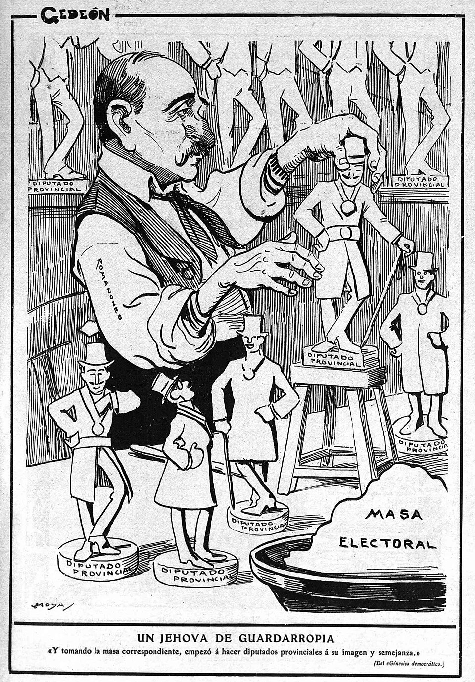 カシキズムと復古 主な記事: ターン 「カシキズム」という用語は、復古王政の政治体制を指すために早くから使われていた。1891年の総選挙では、政府が勝利したにもかかわらず、人々はすで に「カシキズムという忌まわしい災い」を批判していた[30]。しかし、この用語が広く使われるようになったのは、「[18]98年の惨事」以降のことで ある。同年、自由主義者のサンティアゴ・アルバは既にこの惨事を「耐え難いカシキズム」のせいだと指摘していた。[31] カシキズムは特に政権末期まで、地方で重要な役割を果たした。改革派から批判され、大都市や世論からも非難されたものの、こうした批判は国内の大部分では ほとんど影響を持たなかった。地方の貧しい層でさえこの制度を容認しており、小さな町では少なくとも一人は関与していない家族はほとんどなかった。 [32] 結局、地方支配者制度は、その行動が大多数に無関心を呼び起こしたこと、そして有権者の相当部分が効果的に動員されなかったことによって可能となったので ある。[33] 1901年、マドリード・アテネオはスペインの社会政治制度に焦点を当てた調査と討論会を実施し、約60名の政治家や知識人が参加した。再生主義者ホアキ ン・コスタは、その議論を『スペインの現行政府形態としての寡頭政治と地方支配層』[fr]と題した著作にまとめた。緊急性と潜在的な解決策。この問題に 対処するには緊急の行動が必要だ。コスタは著作で、スペインの政治情勢は寡頭政治に支配されており、真の代表制も政党も存在しないと論じている。この少数 派の利益は彼ら自身のもののみに奉仕し、不正な支配階級を生み出している。寡頭制の最高幹部、いわゆる「首脳」は、権力の中心地マドリードに拠点を置く職 業政治家から成る。この集団は、全国各地に散在し、様々な程度の権力と影響力を持つ「地方支配者」の広範なネットワークによって支えられている。支配的な 「首脳」と地方の支配者との関係は、地方行政官によって確立された。コスタは報告書で、寡頭政治と地方支配者制度は制度の異常ではなく、むしろ規範であり 統治構造そのものだと主張した。調査討論会参加者の大多数はこの見解に同意し、これは今日でも広く共有される視点である。一世紀以上を経た現在、カルメ ロ・ロメロ・サルバドールは、コスタの二語による記述が歴史文献や教科書の見出しとなり、復古王政期を描く最も一般的な用語として残っていると指摘する。 [34] 一例として、1960~70年代に広く用いられた大学教科書でホセ・マリア・ホベルは復古王政体制を次のように特徴づけている: 「したがって我々は、憲法の条文には確かに規定されていない憲法上の現実を目の当たりにしている。この現実は二つの事実上の制度に基づいている。一方で は、両党(大臣、上院議員、下院議員、地方行政官、新聞発行者など)の出身者で構成され、その社会的出自と支配的社会的集団(地主、世襲貴族、実業家ブル ジョワジーなど)との家族的・社会的関係によって緊密に結びついた寡頭制、すなわち支配的政治的少数派の存在である。他方では、農村地域における一種の領 主制の残滓が存在する。これにより、町や地域において、経済力、行政機能、威信、あるいは寡頭政治層に対する「影響力」によって際立つ特定の人物が、直接 的に大勢の人々を支配している。この領主制の残滓は、カシキズムと呼ばれる。マドリードの「政治家」、各地方の「カシケ」、そして両者を結ぶ各州都の行政 長官が、この制度の実質的な機能における三つの要となる。 ![]() モヤ作「選挙用粘土」による、ローマノネス伯爵の風刺画。「自らの姿に似せて地方代議士を作り上げる」場面(ゲデオン、1911年)。 マヌエル・スアレス・コルティナは、コスタやグメルシンド・デ・アスカラテら復古王政体制批判者たちが、当時の政治運営を新たな封建制と見なしていたと指 摘する。すなわち、市民の政治的意思がエリート層の利益のために乗っ取られた形態であり、選挙不正と腐敗を通じて国民の真の意思を乱用する寡頭政治であっ た。この「解釈の系譜」はマルクス主義及び自由主義的なスペイン史学において強化された[35]。コスタの分析に対する同種の解釈は、フェリシアーノ・モ ンテロ[fr]が引用するホアキン・ロメロ・マウラも共有しており、彼もまた、この解釈がスペイン復古王政期におけるカシキズム現象に対する最も一般的な 説明であったことに同意している。ロメロ・マウラによれば、コスタ及び同解釈を支持する者らは、カシキズムを土地所有者・金融エリートの経済的支配が政治 的に顕在化したものと見なす。この現象は、国内諸地域における経済発展の遅れや社会統合の低さ(通信網の不備、閉鎖的な経済、高い非識字率などの要因を含 む)がもたらした有権者の無関心が助長している。[36] 1970年代初頭、ホアキン・ロメロ・マウラ、ホセ・バレラ・オルテガ、ハビエル・トゥセルら歴史家たち