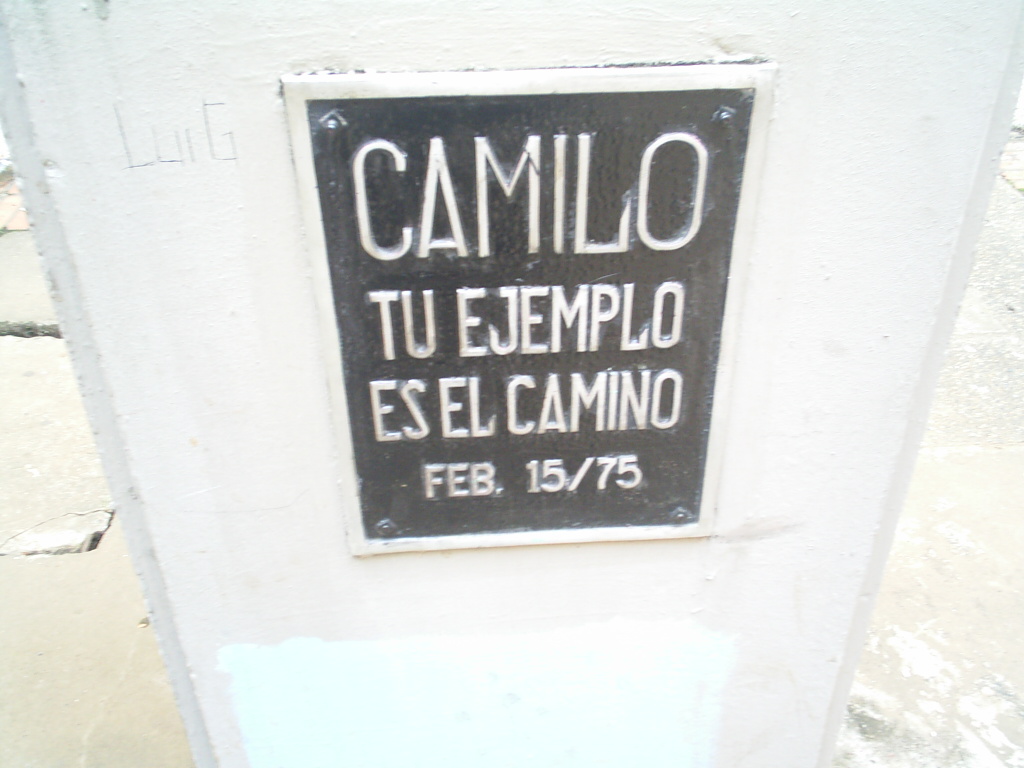 称賛と遺産 大学における追悼 アンティオキア大学のメイン劇場は「カミーロ・トーレス・レストレポ司令官」人民劇場と名付けられている。 サンタンデール工業大学の主要な建物の一つは「カミーロ・トーレス棟」と名付けられており、外壁には彼の肖像と彼が記した言葉が刻まれた大きな壁画が見られる。 バジェ大学カリ本部には追悼の胸像が設置され、複数の大学施設には彼の肖像が描かれている。 ベルギーのルーヴェン・カトリック大学では、大規模な学生寮が「カミーロ・トーレス」の名を冠している。 歌 ウルグアイのシンガーソングライター、ダニエル・ヴィリェッティは1967年にカミーロ・トーレスを題材にした「光の十字架」を作曲した。この曲はチリの シンガーソングライター、ビクトル・ハラによって広く知られるようになった。またキューバのシンガーソングライター、カルロス・プエブラもカミーロを題材 にした「カミーロ・トーレス」という曲を作った。メキシコのシンガーソングライター、ホセ・デ・モリーナの曲「司祭でありゲリラ兵」は、カミーロ・トーレ スと、同じ理想のために戦い続ける他の司祭たちに捧げられている。 ![]() カリ本部のバジェ大学にあるカミーロ・トーレスの胸像の説明文 ラテンアメリカにおける追悼 1987年、ELNはカミリスト連合 - 国民解放軍と改名された。[10] チリのキリスト教左派政党に近いカミーロ・トーレス壁画部隊は、アウグスト・ピノチェト軍事独裁政権下で活動し、政権批判の壁画を描いた。その作品は明るいデザインが特徴で、チリ共産党のラモナ・パラ旅団が用いたものより抽象性が低かった。[48] フィデル・カストロはカミーロ・トーレス神父の存在を知っており、彼について「カミーロはラテンアメリカ諸国民の運動を鼓舞すべき革命的団結の象徴である」と述べた。[35] |