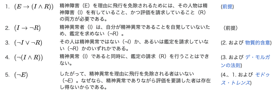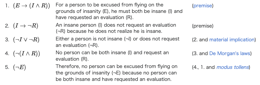 論理 ジョセフ・ヘラーが描いた典型的な「キャッチ・22」とは、米陸軍航空軍の爆撃手ジョン・ヨサリアンが、戦闘飛行から外れることを望んでいるという事例で ある。彼が戦闘飛行から外れるには、飛行隊の軍医による診断を受け、「飛行不適格」と判定される必要がある。「飛行不適格」とは、そのような危険な任務に 志願するパイロットのことだ。死の危険を冒してまで志願する者は、正気ではないとみなされるからだ。しかし、評価を受けるには本人が評価を申請しなければ ならない。その行為自体が、正気であることの十分な証拠とみなされるのだ。こうした条件により、「飛行不適格」と認定されることは不可能となる。 「キャッチ・22」とは、「戦闘任務から抜け出したいと願う者は、実際には正気である」ということだ。[14] 精神適性検査を申請するパイロットは正気であり、したがって戦闘任務に就かなければならない。同時に、パイロットが検査を申請しなければ、検査を受けるこ とは決してなく、したがって正気でないとは判定されず、つまり彼もまた戦闘任務に就かなければならない。キャッチ-22は、たとえ正気でなかったとして も、パイロットが正気でないことを理由に飛行停止処分を受けることが決してないことを保証している。 この状況の論理的定式化は以下の通りである: ![]() したがって、精神異常でありながら評価を請求した人格は存在し得ないため、精神異常を理由に飛行を免除される人格はいない(¬E)。 (4.、1. およびモダス・トレンス) 哲学者ローレンス・ゴールドスタインは、「飛行士のジレンマ」は論理的にはいかなる状況下でも真となる条件ですらないと論じている。それは究極的には無意味な「空虚な双条件」である。ゴールドスタインは次のように書いている[15] 肝心な点はここだ。飛行士が危険な任務の飛行を免除される条件を述べたように見えるこの文は、次の文に還元される (i) 「空軍兵が危険な任務の飛行を免除されるのは、かつ、かつ、Cont(ここで『Cont』は矛盾である)の場合に限る」 (これは不快な真実を巧妙に隠す手段となり得る)という命題ではなく、無価値で空虚な宣言 (ii) 「空軍兵が危険な任務の飛行を免除されるのは、かつ、かつ、空軍兵が危険な任務の飛行を免除されることがあり得ない場合に限る」 もしその落とし穴が(i)であれば、それほど悪くはなかっただろう――飛行士は少なくとも、いかなる状況下でも戦闘任務を回避できないことを知ることがで きただろう。しかし『キャッチ22』はそれよりも悪い――何の意味もなさない言葉の羅列であり、内容がなく、情報を全く伝えていないのだ。 |