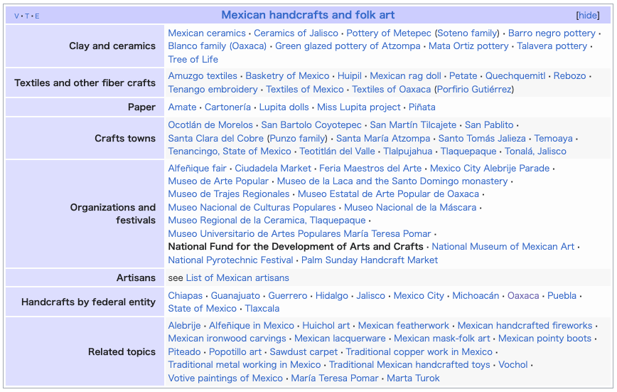 国立手工芸振興基金(FONART)は、メキシコ連邦政府の公的信託であり、文化省に属している。[1] 1974年に設立され、メキシコの手工芸を促進・普及させ、手工芸家が手工芸品の販売によりより良い収入を得られるよう支援することを目的としている。[2] FONARTは、研修や技術支援[3]、生産支援[4](原材料の購入)、支援機器による職人の健康予防[5]、公正な価格での地域社会における工芸品の 買い付け [6]、FONARTの店舗や国内外のフェアや展示会での販売による販路拡大、地域・地方・全国レベルでの工芸品コンテスト、戦略的プロジェクト、観光 地における工芸ワークショップの改装とプロモーションなどを通じて、手工芸品の生産プロジェクトを支援している。[7] FONARTは2016年に48,748人の職人に直接的な恩恵をもたらした。メキシコシティに4つの販売拠点を持ち、KichinkおよびAmazonメキシコプラットフォームでオンライン手工芸品の販売も行っている[8]。 |