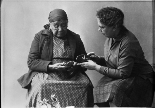 ![]() フランシス・デンスモアが、プレーリー島のスー族出身者であるスーザン・ウィングロウと共に、インディアンの標本を調べている。 |