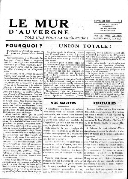 月) 1943年11月、ゲシュタポに目をつけられたジャン・ロションは、ポールアゲに身を隠した。ジョルジュ・カンギレムが、ラフォンという偽名で、必要に応 じてリベラシオン・シュッドの地方支部の代表を代行することになった[37]。 南部地域は占領から1年が経過した1943年11月25日、ストラスブール大学の構内で一斉検挙が行われた。廊下で、ゲシュタポの隊員がパピロロジーの教 授ポール・コロンを射殺した。逮捕された110人、アルザス地方出身者を含む人々は強制送還された。ジョルジュ・カンギレムは大学に戻らなかった。彼は、 マギス(レジスタンス)のための医療サービスの組織化に尽力し、その活動には、医師ポール・ライスとルイ・マレ、薬剤師ピエール・ニュグーとアンヌ・マ リー・ムヌ、そして、ロジェ・ギニャール、マルセル・ショマール、フェルナン・ラファイ、シャルル・ベレンホルク、ジャン・シモン、ロレット・マイヤーな どの若いボランティアたちも参加した。数週間後、1944年の初め、オーブラックの小さな村モーレーヌに、彼は秘密の診療所を設立した。 1943年12月23日、彼はジャン・ロション[37]に代わって、MURの地域司令部会議に出席した。2月、ロションは隠れ家からパリの秘密軍中央司令 部に呼び出された。ジョルジュ・カンギレムは、1944年2月10日の会議でも再びリベラシオン・シュッドを代表することになった[37]。 ![]() オーヴェルニュの壁、第1号から第10号、統一レジスタンスの地域宣伝機関で、ジョルジュ・カンギレムはリベラシオンを代表していた. 1944年4月30日[38]から5月2日まで、ポールアゲ近くのサント・マルグリットにあるボイトゥー農場で開催された第3回会議には、アンリ・イング ランをはじめ、多くの代表者が参加した。モーリス・ジュアノー[39](フラン・ティルール代表)、レイモン・ペリエ(フランス労働者運動代表)、ジャ ン・ビュテ(社会党代表)、ピエール・ジラルドとロジェ・ヴァロン(フランス共産党代表)、シャルル・エルダン(国民戦線代表)、ロベール・ユゲ(オー ヴェルニュのレジスタンス組織代表)が参加したが、FTPF(フランス人民解放軍)は、他の組織とは一線を画し、圧倒的に多数を占めていた[38]。アリ エ県のルネ・リビエール、カンタル県のジャン・ルパンとピエール・クートン、オート・ロワール県のセルジュ・ザパルスキーといった各県の指導者たちは、総 動員を目的として招集された[38]。ジョルジュ・カンギレムは、MURを構成する各グループの政治機能と軍事機能をそれぞれ統合することで、分裂を解消 する再編案を採択させた[37]。「R 6 作戦が今後、例外的なものとなることを考慮すると、この 2 つの参謀本部を 1 人の人物が統括することが必要である。これにより、調整の役割を果たし、文民の軍に対する優位性を明確に示すことができる」[40]。アンリ・イングラン が両参謀本部の議長に選出され、エミール・クーラドンが地域軍事責任者に、ジョルジュ・カンギレムが政治参謀本部長に任命された[37]。つまり、武器に 対する嫌悪感を持ち続けたカンギレムは、軍事行動の正当性を保証する文民としての役割を担うことになった。 クレルモン・フェランに戻る途中、シャンリエールでドイツ軍のパトロールに呼び止められた。夜間外出禁止令の時間帯だった。彼は銃を向けられた[37]。 5月、エミール・クーラドンはマルジェリード山脈で徐々にFFI(フランス国内軍)を組織した。若者たちは、クレルモン・フェランから、また田舎からも、 単独またはグループで、多くの場合電車でやって来た。彼らは10キロ圏内に15個中隊に分かれて配置された。SOE(英国特殊作戦執行部)から、3000 丁のライフルまたはサブマシンガン、150丁の機関銃、数発のバズーカ、3000~4000発の手榴弾、弾薬、爆発物などがパラシュートで投下された。  |