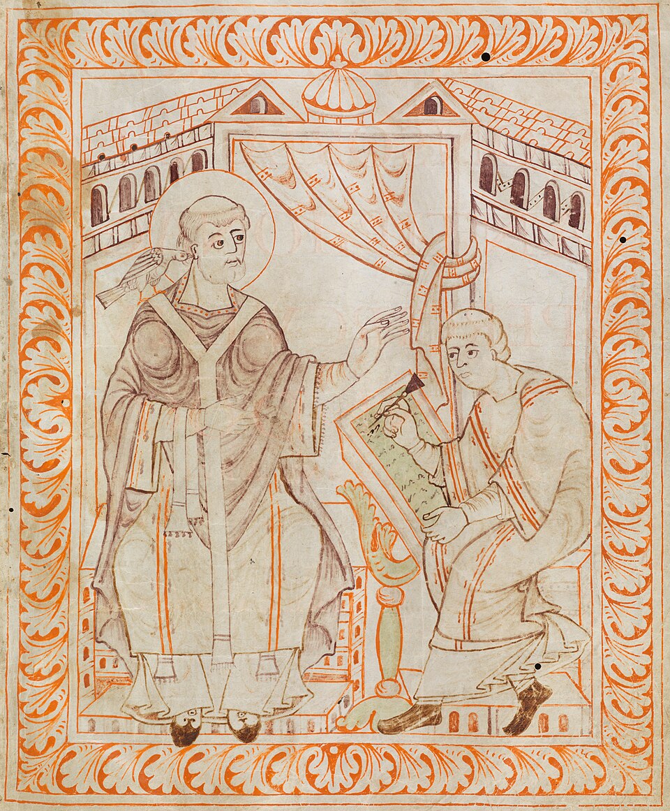 教皇グレゴリウス大司教![]() グレゴリウス大司教は、聖霊(鳩の姿)から授かったグレゴリオ聖歌を、書記官ペトルス・ディアコヌスに口述している。蝋板には、ニューム(音符)が記され ている。[7] [8] 西暦 1000 年頃の描写。 グレゴリオ聖歌は、教皇グレゴリウス 1 世(604 年没)にちなんで名付けられた。彼はグレゴリウス大教皇とも呼ばれている。ほぼ同時代、7世紀末に初めて文書で確認されている[9]、ローマでスコラ・カ ントラムが設立された。これは典礼の歌やレパートリーの維持と発展に非常に重要な役割を果たした。スコラ・カントラムは、聖職者の入場時にイントロイトゥ スを、聖体拝領時にはコミュニオを定期的に歌った。さらに、時課礼拝のための聖歌、賛美歌、典礼のための聖歌も作曲されたが、作曲者の名前は伝わっていな い。 グレゴリウスという教皇が、後にグレゴリオ聖歌と呼ばれるようになった聖歌と関係があったとされることは、9世紀後半、モンツァのカンタトリウムの序文に 初めて文書で証明されている。[10] そこには次のように書かれている。 「グレゴリウス・プレスル […] CONPOSUIT HUNC LIBELLUM MUSICAE ARTIS SCOLAE CANTORUM.」[11] 「プレスル・グレゴリウス […] は、スコラ・カントラムのために、以下の音楽芸術に関する本を書いた。[12][13]」 しかし、より古い、失われた原典を参考にしたプロローグの著者が、グレゴリウス1世を指しているのか、それともグレゴリウス2世を指しているのか、また、 プレスル・グレゴリウスが単にテキストの編集者としての著者であるのか、それとも聖歌の音楽版作曲者でもあるのか、は不明である。[14][15] 後者については、875年頃、ヨハネス・ディアコヌスが『グレゴリウスの生涯』の中で、グレゴリウス1世が聖霊の霊感によって作曲した楽曲の作者であると 述べている。この伝記は広く普及し、しばしば写本され、注釈が付けられた。[16][17] 11 世紀の関連写本のタイトルは、象徴的に『音楽について、そしてそれが聖グレゴリウスによって最初に発明された経緯について』というものである。[18] しかし、歴史家や音楽学者の一致した見解では、教皇グレゴリウス1世はこれらの楽曲の作曲者または編集者とは見なせない。[19] 彼の作者性が主張または想定されたのは、疑う余地のない精神的権威に裏打ちされた、ローマ典礼の形式、レパートリー、旋律を神から与えられたものとして固 定化するためだった。一方、グレゴリウス大司教自身は、当時のいかなる典礼も模範とすべきだと主張することは決してなかった。アングロサクソン人宣教師、 カンタベリーのアウグスティヌス宛ての手紙の中で、彼はこう書いている。「しかし、ローマ、ガリア、あるいは他の教会で、全能の神に特に喜ばれるものを見 つけたなら、それはそれで結構だ。慎重に選び、信仰の基盤がまだ新しいイングランドの教会に、多くの教会から集めた最良のものを取り入れてほしい。」 [20] |