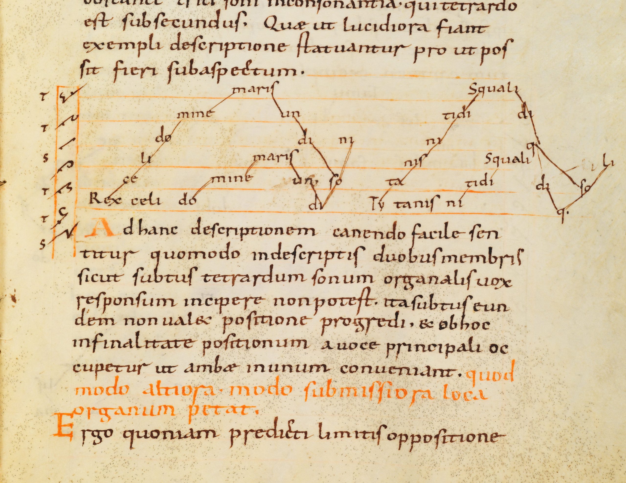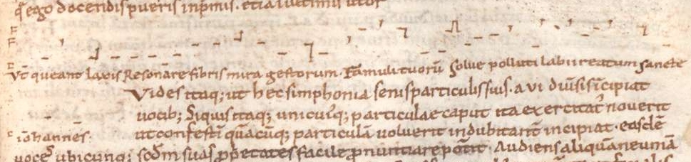 グレゴリオ聖歌の旋律を歌って学ぶ![]() Cantate Domino canticum novum(「主に新しい歌を歌おう」)。詩篇 97 (98)、1 (1400 年頃) の挿絵 神を賛美する歌、Laus Dei は、中世の聖職者や修道院の生活において最も重要な位置を占めていた。[49][50] 「詩篇を歌うことや神を賛美することで、私たちは、その驚くべき神秘の啓示をもって私たちのもとにやって来たいと願う神のための道を備えるのだ」 – ヴィータ・ノトケリ・コグメント・バルブリ[51] 聖職者や修道僧たちは、昼夜を問わず、多くの時間を典礼の歌に費やした。[52] そのため、グレゴリオ聖歌の歌唱は、中世のさまざまな学校での授業で教えられ、理論的な文献でも扱われた。つまり、礼拝での豊富な歌唱に加えて、何世紀に もわたって、まず口頭で歌って、次に歌って覚えるという、苦痛と表現されるメロディーの習得があったのだ。[53] 歌のレパートリー全体を学び、記憶するには、その後約 10 年間の練習が必要とされた。 ![]() ナウムブルク大聖堂の聖歌集が置かれた譜面台。開かれているのは、キリストの昇天の祭典(Viri galilei)の典礼歌である。 ヌメーヌの発明は、主任カントールと音楽教師にとってのみ、負担の軽減となった。正確な音程を把握するための五線譜の導入も、歌手たちがメロディーを暗記 する必要性をほとんど解消しなかった。中世後期になって、遠くからでも読める大きな文字で書かれた聖歌集から初見で歌うことが、この点において大きな助け となったんだ。[54] そのような聖歌集の一例としては、カンブレー写本がある。 ![]() ヨハネの賛美歌「Ut queant laxis」の最初の節。グイド・ダ・アレッツォがポンポサの修道士ミケーレに宛てた手紙の一部(1030年頃~1032年頃)。 8世紀のローマのスカラ・カントラムでは、すでに少年たちが歌っていた。彼らの高い声と、男性の高音テノールは、天使たちの歌声を象徴するものと考えられ ていた。つまり、多くの場合貧しい家庭出身の子供たち[55][56] も、聖歌隊の歌唱のために厳しい学校教育を受けていた[57]。その後数世紀にも、少年たち(pueri)が聖職者の歌唱の任務を引き継ぎ、その見返りと して聖職者たちが少年たちの生活費を負担することが多かった[58]。 Johanneshymnus Ut queant laxis, YouTube 試 聴 ヨハネの賛歌、ラテン語の歌詞 グイド・ダ・アレッツォは、その著書『ミクロログス』の中で、メロディーを習得し、音程を見つけるための正確な指示を記している。彼が引用し、聴覚訓練の ための未知の歌について修道士ミカエルに宛てた手紙の中で推奨したヨハネの賛歌は、その教育の目的をプログラム的に述べている。[59] 「聖ヨハネよ、あなたの弟子たちの汚れた唇から罪を解き放ち、彼らがあなたの奇跡の行いを、リラックスした声帯で歌えるようお導きください。」 モードは、メロディーを口頭で教えられた、読み書きができない歌手たちにも区別できた。なぜなら、モードは、それぞれのモードの音を教える、暗記したイン トネーションの公式、あるいはノエノエの公式(melodiae、formulae、moduli、neumae regulares などと呼ばれる)によって、彼らにも体験できるものだったからだ。[60] 教師は、手を使って補助することもできた。[61] 声の出し方をリラックスさせることに加え、唇を丸く開いて(ore rotunda)歌うことも目指した。体は伸ばし、頭は上げ、少し後ろに傾ける。上腕は体に密着させた。前腕と手は、ジェスチャーで歌詞の内容と表現、ア フェクトゥス(affectus)を補強した。[49] そのため、学校ではメロディーだけでなく、歌詞の意味も教えた。こうした詳細や類似の情報を知っているにもかかわらず、目指した声の響きは想像するしかな い。[62] |