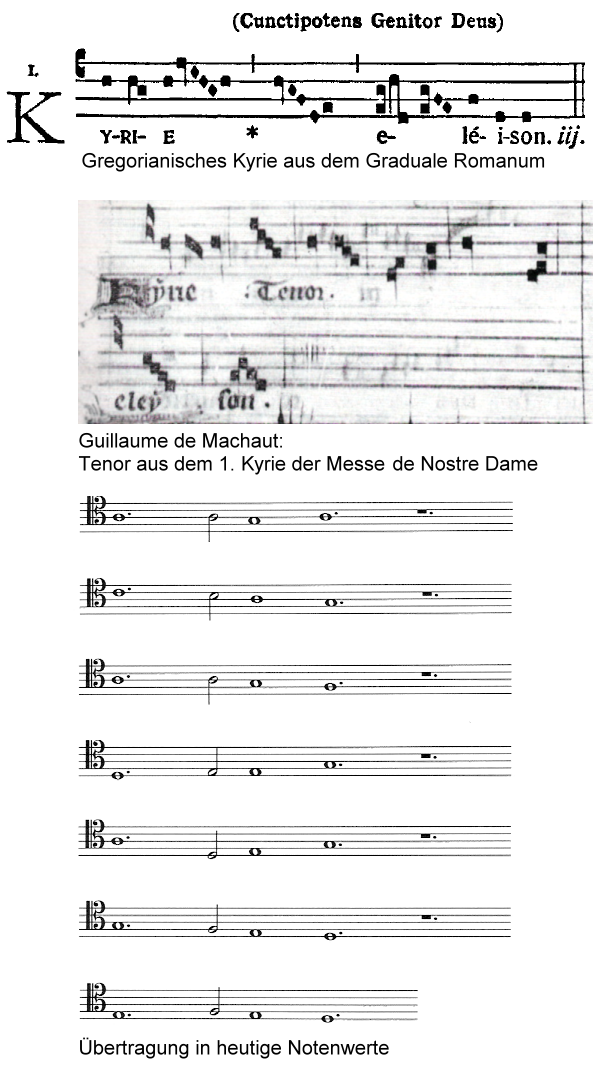 mittelalterliche Mehrstimmigkeit![]() Ein gregorianisches Kyrie als isorhythmischer Tenor in Guillaume de Machauts Messe de Nostre Dame Mittelalterliche Mehrstimmigkeit und gregorianischer Choral standen in einem gegenseitigen Wechselverhältnis. Einerseits war die Entwicklung der Mehrstimmigkeit zumindest bis ins 15. Jahrhundert hinein abhängig von den gregorianischen Melodien und deren liturgischer und theologischer Bedeutung, andererseits sorgte die Verbreitung der Mehrstimmigkeit dafür, dass das Interesse am einstimmigen liturgischen Gesang und die Kenntnisse über ihn immer mehr abnahmen. ![]() Zu Lehrzwecken notiertes Organum über die Sequenz Rex celi aus Musica enchiriadis Die frühesten, schriftlichen Berichte über Mehrstimmigkeit im Gottesdienst der Klöster und Kathedralen betreffen improvisierte Zweitstimmen zu gregorianischen Melodien. Erstmals theoretisch erfasst und graphisch dargestellt wurde die Mehrstimmigkeit in Form des Organums in der Musica enchiriadis noch vor 900 n. Chr.[72][73][74] Größere Bedeutung erlangte die Mehrstimmigkeit auf der Grundlage von Abschnitten der gregorianischen Melodien, die als Cantus firmus dienten, in der St. Martial-Schule und in der Notre-Dame-Schule. Die ersten namentlich berühmten Komponisten geistlicher Mehrstimmigkeit waren Leonin („optimus organista“) und Pérotin („optimus discantor“). Sie wirkten im späten 12. und frühen 13. Jahrhundert in der Kathedrale von Notre-Dame in Paris.[75] Die Musik seit der Zeit der Notre-Dame-Schule wurde ab etwa 1320 abwertend als Ars antiqua bezeichnet, die eigene Kunst des Komponierens dagegen als Ars nova. Die Komponisten der Ars nova wie Guillaume de Machaut nutzten zwar den gregorianischen Choral, indem sie zum Beispiel einen Abschnitt einer gregorianischen Melodie als Cantus firmus in isorhythmische Teile zerlegten und damit ihrer Komposition ein Gerüst gaben, entfernten sich dabei aber gänzlich vom ursprünglichen, spirituellen Charakter des gregorianischen Chorals.[75] Die Neuartigkeit der mehrstimmigen Kompositionstechniken stieß lange Zeit auf den Widerstand der Kirche. So kritisierte Papst Johannes XXII. den neuen Stil in einer Bulle von 1325 und verlangte unter Androhung von Kirchenstrafen die Wiederherstellung des einstimmigen Gesanges. Dem Papst zufolge sollten aus theologischen Gründen in der bisweilen zugelassenen mehrstimmigen Kirchenmusik gregorianische Melodien den Gang der Komposition bestimmen. Derlei Restriktionen konnten dem Siegeszug der Mehrstimmigkeit auch in der Kirchenmusik auf Dauer keinen Einhalt gebieten.[76][77] ![]() Josquin des Prez: Missa de Beata Virgine. Das gregorianische Kyrie zum Fest Beata Maria Virgine wird in allen vier Stimmen durchimitiert und paraphrasiert. Die Cantus-firmus-Technik auf der Grundlage gregorianischer Melodien oder Melodieabschnitte erfuhr ihren Höhepunkt im 15. Jahrhundert. Allerdings wurden vermehrt auch andere Melodien als Cantus firmi verwendet. Dadurch wurde die Abhängigkeit der Mehrstimmigkeit vom gregorianischen Choral geringer. Andererseits konnte eine gregorianische Melodie in durchimitierenden Satztechniken die Motivik aller Stimmen erfassen, wie im Kyrie der Missa da Beata Virgine, einem Spätwerk von Josquin des Prez aus dem ersten Viertel des 16. Jahrhunderts. Doch gegen Ende des 16. Jahrhunderts verlor sich die Bedeutung der gregorianischen Melodien als Kompositionsmaterial. Das gelegentliche Zitieren und Verarbeiten gregorianischer Motive und Melodien war ab da kaum mehr liturgisch bestimmt und hatte eher den Wert eines archaischen Symbols.[75] Die Verschriftung und die Verwendung des gregorianischen Gesangs in der Mehrstimmigkeit vom 9. bis zum 15. Jahrhundert hatten sich auf die Vortragsweise und auf die liturgische Bedeutung des gregorianischen Gesanges negativ ausgewirkt. Er wurde vom lebendig vorgetragenen Gotteswort sukzessive zu einem äqualistisch vorgetragenen Cantus planus, der durch den Vortrag in den die Obertöne verstärkenden gotischen Kathedralen die Entwicklung der Mehrstimmigkeit förderte. So schreibt Godehard Joppich:[78] „Das Vertrauen auf die Schrift führte zur Vernachlässigung des Erinnerns. Das Bedürfnis, die über lange Zeit mündlich tradierten Melodien aufzuschreiben, drängte überraschenderweise in ganz Europa fast gleichzeitig zur Bildung verschiedener Notationen. Es scheint von der Sorge ausgelöst, die Vielzahl der Melodien und alle ihre Vortragsnuancen nicht länger fehlerfrei im Gedächtnis behalten zu können.“ |