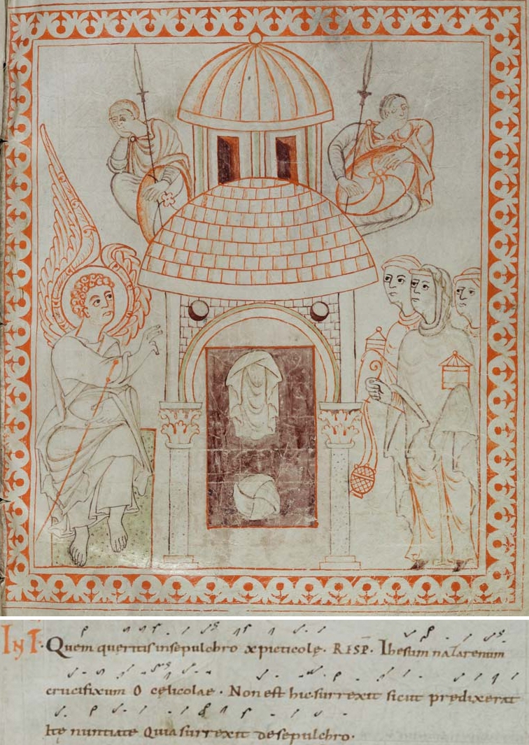 グレゴリオ聖歌への中世の追加![]() クエム・クァエリツ・トロパスと図像:イエスの空の墓で天使と対話する三人の女性たち。ハートカーによる描画および記述(Cod. Sang. 391、990年から1000年頃) カロリング朝時代頃、グレゴリオ聖歌はすでに定着していた。しかし、中世後期、17 世紀に至るまで、レパートリーに加わる新作が創作され続けた。 トロップ カロリング時代、公式に認可された聖歌には、トロップと呼ばれるさまざまな種類の追加や変更が加えられた。これらは、既存のメリズムに歌詞を付けること や、新しいメリズムや歌詞付きの旋律部分を挿入・追加することである。[67] シークエンス 再生時 間:2 分 38 秒 2:38 ペンテコステのシーケンス Veni Sancte Spiritus アレリア(Jubilus)の終結メリスマに歌詞が付けられた 850 年頃、シーケンスの歴史が始まった。12 世紀までに、アレリアとは独立した、韻を踏んだ、リズムが調整された詩節からなる韻律シーケンスが形成された。それは、大規模な詩節連祷へとつながった。 詩節連祷は、複数の詩節で構成され、韻律的に整えられた、韻を踏んだ賛美歌の構造を持つ。詩節には、繰り返されないさまざまな旋律がある。それらは中世後 期に非常に人気を博し、約 5000 の詩節連祷が知られている。 トリエント公会議(1545年~1563年)は、図形音楽に関する規制に加え、グレゴリオ聖歌に関する規定も定めた。その結果、中世後期の連祷のうち、 ローマ典礼で認められたのは4つだけとなった。[68] 1727年には、5つ目の連祷が導入された。[69] 賛美歌 グレゴリオ聖歌に関連して、賛美歌とは、固定の韻律、韻、繰り返しのメロディーを持つ詩歌のことだ。[70] 歌詞は自由に詩作されており、グレゴリオ聖歌の他の曲のように、聖書や詩篇に由来するものではない。賛美歌は、典礼において、聖務日課の中でその位置を占 めている。 連祷は 9 世紀に発明されたものだが、賛美歌は 3 世紀から 4 世紀にかけてすでに典礼で使用されていた。その起源は古代の詩や音楽にあり、キリスト教の典礼音楽は、異教の古代の伝統や慣習からの脱却を求めていたた め、ある意味で特別な存在だった。最も有名な古代の賛美歌作家の一人は、教父アンブロシウス・ミラノだった。賛美歌は、アンブロシウス聖歌の特別な特徴 だ。聖ベネディクト・ヌルシアは、各時課ごとに特別な賛美歌を用意していた。[71] 参照:カテゴリ:ラテン語の賛美歌 |