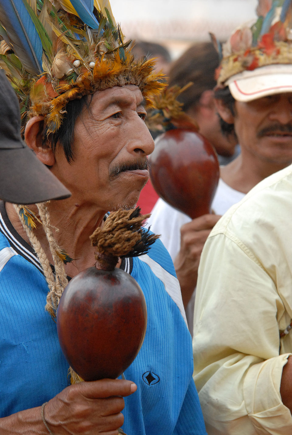 パラグアイのレデュクシオン 詳細記事: イエズス会のレデュクシオン ![]() 現代のグアラニー族シャーマン 1607年、スペイン国王フェリペ3世はリオ・デ・ラ・プラタ総督エルナンダリアス・デ・サアベドラに書簡を送り、新たに到着したイエズス会士を派遣して 宣教活動を開始するよう指示した[12]。スペイン王室の保護のもと、最初のグアイラ宣教所ロレートが1610年にホセ・カタルディーノ神父とシモン・マ チェラータ神父によってパラナパネマ川に設立された。イエズス会のルイス・デ・モントヤ神父は著書『霊的征服』で、宣教活動の困難さとグアラニ族との交流 について論じた。モントヤによれば、グアラニ族の首長ミゲル・アルティグアイェは当初宣教地への参加を拒んだが、別の先住民集団から脅威を受けると態度を 変えた。アルティグアイェは宣教地に戻り、保護を懇願したのである。[13] 奴隷化から身を守る唯一の現実的な手段として、グアラニ族はミッションに殺到した。その結果、4万人のグアラニ族全員を収容するため、さらに12のミッ ションが短期間で次々と設立された。イエズス会はスペイン当局とグアラニ族首長たちの間の仲介役と見なされていた。[14] イエズス会ミッションは新たな改宗者を必要とし、ミッション維持のための労働力も求めていた。グアラニ族は宣教地住民を養う作物の栽培に加え、宣教地の資 金源となる販売・交易用製品の生産にも従事した。[15] この成功に刺激され、ゴンサレス神父と二人の同行者は1627年、ウルグアイ川東岸(現在のウルグアイ共和国)へ進出し、二、三の小規模な宣教地を設立し た。しかし現地部族は神父と改宗者を殺害し、宣教地を焼き払った。 奴隷狩りたちはグアラニ・ミッションを「一挙に通常より多くのインディオを捕らえる好機」と見なした[4]。1629年、パウリスタの軍勢がサン・アント ニオ・ミッションを包囲し、教会やその他の建物を焼き払い、抵抗した者や移動できないほど幼い者・老いた者を殺害し、残りを奴隷として連れ去った。サン・ ミゲルとヘスス・マリアもすぐに同じ運命をたどった。最終的にカタルディーノ神父が集めた増援部隊が奴隷狩り集団を撃退した。2年以内に2箇所を除く全て の施設が破壊され、6万人のキリスト教改宗者がサンパウロやリオデジャネイロへ売り飛ばされた。襲撃は通常、日曜日に全住民がミサに集まる時間帯に行われ た。司祭は概ね生かされたが、数名は殺害された。 パウリスタの侵攻直前に約10万人いた先住民は、わずか数千人にまで減少した。アントニオ・ルイス・デ・モントヤ神父は1万頭の牛を購入し、先住民を農耕 民から牧畜民へと転換させた。間もなくランソンシエ神父とロメロ神父の下でウルグアイの宣教地が再建された。1632年、マメルコスは南からの新たな攻撃 ルートを発見した。1638年、幾つかの抵抗は成功したものの、ウルグアイ川以遠の12の宣教地は全て放棄され、その住民は宣教地地域の共同体に統合され た。最後の襲撃でアルファロ神父は殺害された。 同年、モントヤ神父は、アスンシオン総督と司教による先住民の自由と宣教地運営の制限を企てた動きに抵抗して成功した後、ヨーロッパに向けて出航した。こ の渡航で彼は、宣教師の奴隷化を最も厳しい教会の罰則で禁じるウルバヌス8世の書簡と、グアラニー族が自衛のため銃器を携帯し、イエズス会士となった退役 軍人からその使用法を訓練されることを許可するスペインのフェリペ4世の書簡を獲得することに成功した。 1641年、800名のパウリスタ軍が再び宣教地を攻撃した際、アカライ川で銃を装備したキリスト教徒グアラニー軍と遭遇した。二度の戦闘でパウリスタ軍 は苦悩し、その後10年間は侵攻が阻止された。1651年、スペインとポルトガルの戦争を背景に、ポルトガル領拡大を目的としたパウリスタ軍の攻撃が再び 起こった。スペイン軍が宣教地防衛に駆けつける前に、宣教師自らがグアラニ軍を率いて敵と戦った。1732年、最盛期を迎えたグアラニ宣教地は、訓練され 装備の整った7,000人のグアラニ軍によって守られていた。この宣教地軍は、司祭たちと共にスペイン植民地を防衛した事例が複数回存在する。 1732年時点で、30のグアラニ・ミッションが存在し、141,252人の改宗グアラニがいた。2年後、天然痘の流行で約3万人が死亡した。1765年には二度目の流行で約1万2千人がさらに死亡し、その後チャコ地方の部族へと西へ広がっていった。 ウルグアイの宣教地は救われた 1750年、スペインとポルトガル間のマドリード条約により、ウルグアイ川流域の7つの宣教地がポルトガルに割譲され、グアラニー族は退去を命じられた。 彼らはポルトガル人を奴隷狩りとして知っていたため拒否した。7年にわたるゲリラ戦争で数千人が死亡した(グアラニー戦争参照)。イエズス会は王令を獲得 し、係争中の宣教地をスペインの管轄下に復帰させた。1747年に2つの宣教所、1760年に3つ目の宣教所が、パラグアイ中部のイタティネ