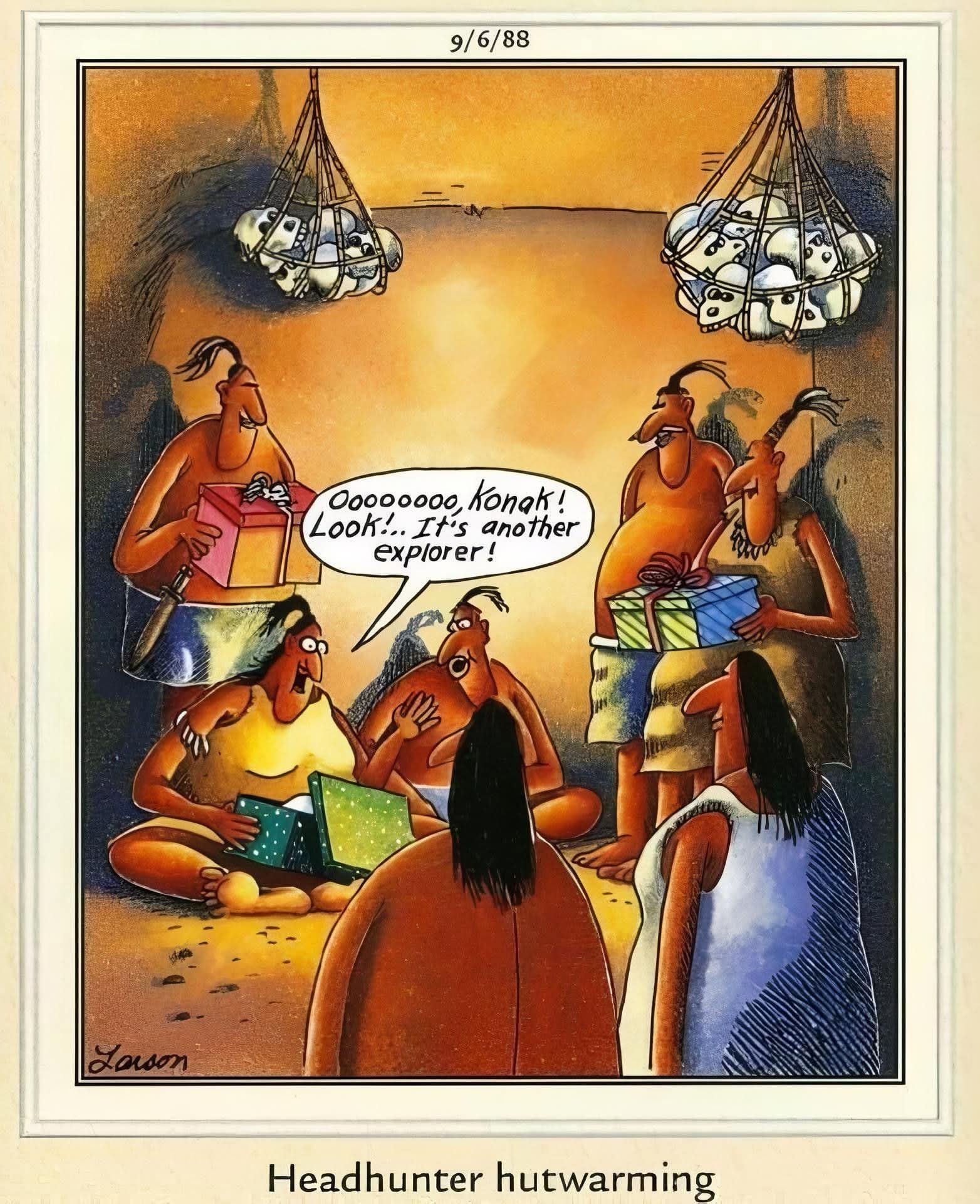 Headhunter hutwarming (首狩族の心あたたまる*話)「おおお、コナック!これは見なよ!!別の探検家のもの[生首]だ」——Gary Larson, Far side シリーズより