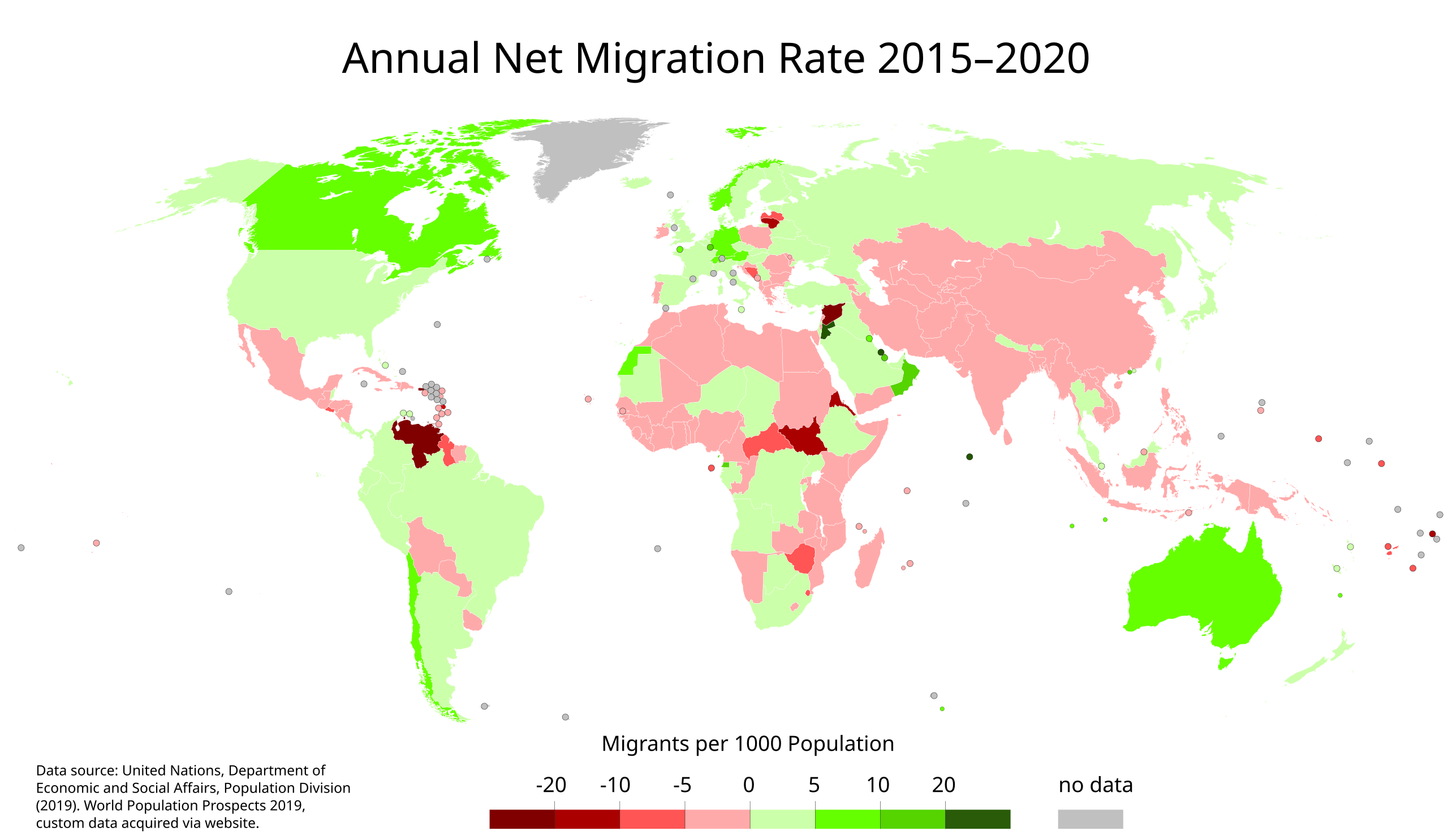 2015年から2020年までの年間純移住率。出典:国連2019年