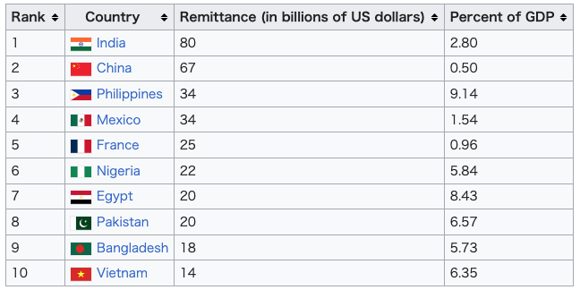 送金 送金(移民労働者が母国に送金する資金)は、一部の国々の経済において重要な部分を占める。2018年の送金受入国トップ10は以下の通りである。 ![]() 経済的影響に加え、移民は社会文化的・市民政治的生活においても多大な貢献をしている。社会文化的な貢献は、食文化・料理、スポーツ、音楽、芸術・文化、 思想・信念といった社会の分野で生じる。市民政治的な貢献は、国家の権威が認められる文脈における市民的義務への参加に関わる。[36] こうした送金の重要性を認識し、国連の持続可能な開発目標(SDGs)目標10は、2030年までに移民の送金取引コストを3%未満に大幅に削減すること を目指している。[37] |