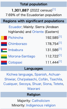 ![]() Shuar people in the park of Logroño, Morona-Santiago. モロナ・サンティアゴ県、ログローニョ公園に住むシュアール人。 1,301,887 (2022 census)[1] 7.69% of the Ecuadorian population Regions with significant populations Ecuador; Mainly: Sierra (Andean highlands) and Oriente (Eastern) Pichincha Province Pichincha 192,585[1] Chimborazo 178,754[1] Imbabura Province Imbabura 131,586[1] Morona-Santiago Province Morona-Santiago 112,722[1] Cotopaxi Province Cotopaxi 111,444[1]  |