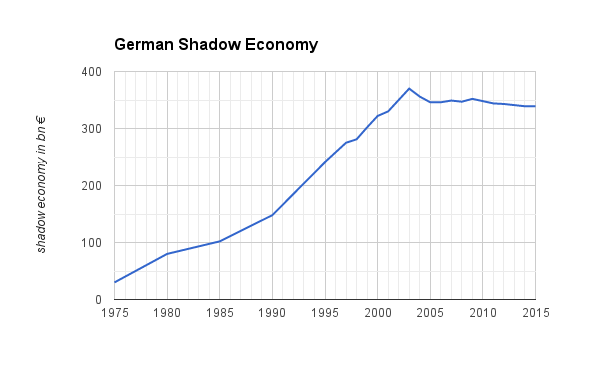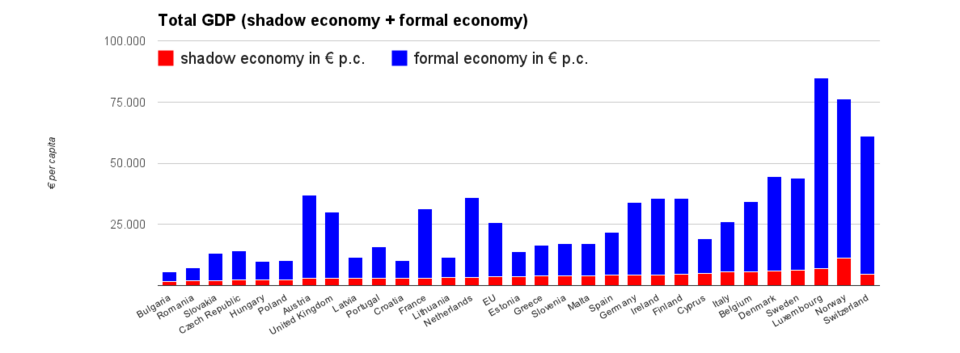 Comparison of shadow economies in EU countries![]() German shadow economy 1975–2015, Friedrich Schneider University Linz[38] As of 2013, the total EU shadow economy had been growing to about 1.9 trillion € in preparation of the EURO[39] driven by the motor of the European shadow economy, Germany, which had been generating approx. 350 bn € per year[38] since the establishment of the Single Market in Maastricht 1993, (see diagram on the right). Hence, the EU financial economy had developed an efficient tax haven bank system to protect and manage its growing shadow economy. As per the Financial Secrecy Index (FSI 2013)[40] Germany and some neighbouring countries, ranked among the world's top tax haven countries. The diagram below shows that national informal economies per capita vary only moderately in most EU countries. This is because market sectors with a high proportion of informal economy (above 45%)[41] like the construction sector or agriculture are rather homogeneously distributed across countries, whereas sectors with a low proportion of informal economy (below 30%)[41] like the finance and business sector (e.g. in Switzerland, Luxembourg), the public service and personal Service Sector (as in Scandinavian countries) as well as the retail industry, wholesale and repair sector are dominant in countries with extremely high GDP per capita i.e. industrially highly developed countries. The diagram also shows that in absolute numbers the shadow economy per capita is related to the wealth of a society (GDP). Generally spoken, the higher the GDP the higher the shadow economy, albeit non-proportional. There is a direct relationship between high self-employment of a country to its above average shadow economy.[42] In highly industrialized countries where shadow economy (per capita) is high and the huge private sector is shared by an extremely small elite of entrepreneurs a considerable part of tax evasion is practised by a much smaller number of (elite) people. As an example German shadow economy in 2013 was €4.400 per capita, which was the 9th highest place in EU, whereas according to OECD only 11.2% of employed people were self-employed (place 18).[43] On the other hand, Greece's shadow economy was only €3.900 p.c (place 13) but self-employment was 36.9% (place 1). An extreme example of shadow economy camouflaged by the financial market is Luxembourg where the relative annual shadow economy is only 8% of the GDP which is the second lowest percentage (2013) of all EU countries whereas its absolute size (€6.800 per capita) is the highest. ![]() Map of the national shadow economies per capita in EU countries. The red scale represents the numbers displayed by the red bars of the diagram on the left. ![]() The total national GDP of EU countries, and its formal and informal (shadow economy) component per capita[39][44] |