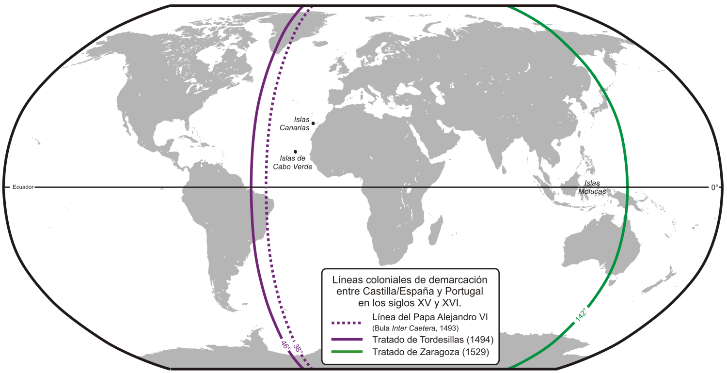 歴史的背景 関連項目:アルカソバス条約 関連項目:クリストファー・コロンブス ![]() 15世紀から16世紀にかけてのカスティーリャ/スペインとポルトガルの境界線。最も広く受け入れられている説に基づく。 1474年から1479年にかけて、カスティーリャ・レオン王位継承をめぐって、2つの陣営が対立した。一方は、故エンリケ4世の娘でポルトガルのアル フォンソ5世と結婚したフアナ・ラ・ベルトラーネハの支持者たち。もう一方は、エンリケ4世の異母妹で、アラゴン王冠の継承者フェルナンドの妻であるカス ティーリャのイサベル1世の支持者たちである。 1479年9月4日、アルカソバス条約によってイベリア半島の王国間の和平が締結された。この条約では、戦争の終結とフアナのカスティーリャ王位継承権の 放棄が合意されたほか、大西洋の領有権がポルトガルとカスティーリャの間で分割された。ポルトガルは、マデイラ、アゾレス諸島、カーボベルデ、ギニア、そ して一般的に、その地域で見つかったもの、征服したもの、発見したもの、占領されているもの、発見されているものすべてに対する支配権を認められた。一 方、カスティーリャはカナリア諸島に限定された。その後数年間、イサベルとフェルナンド(後にカトリック両王として知られる)は、イスラム教徒の王国グラ ナダの征服に軍事力を集中させた。 グラナダは1492年1月2日にようやく降伏した。その数ヶ月後、国王夫妻はクリストファー・コロンブスが提案した、3隻の船で「大西洋」を西へ航海し、 特定の「島々や陸地」を「発見し、獲得する」という計画を受け入れた。[n. 2] 遠征隊は8月にパロス港を出発し、10月にアメリカ大陸に到達した。キューバ島とイスパニョーラ島を探検した後、探検者たちは1493年3月にヨーロッパ に戻った。マルティン・アロンソ・ピンソンはガリシアの海岸に到着し、カトリック両王に報告したが、コロンブスはリスボンに上陸し、ポルトガルの王ジャン 2世と面会した。その後、発見された土地の支配権を決定するため、両王室間で激しい外交交渉が始まった。 |