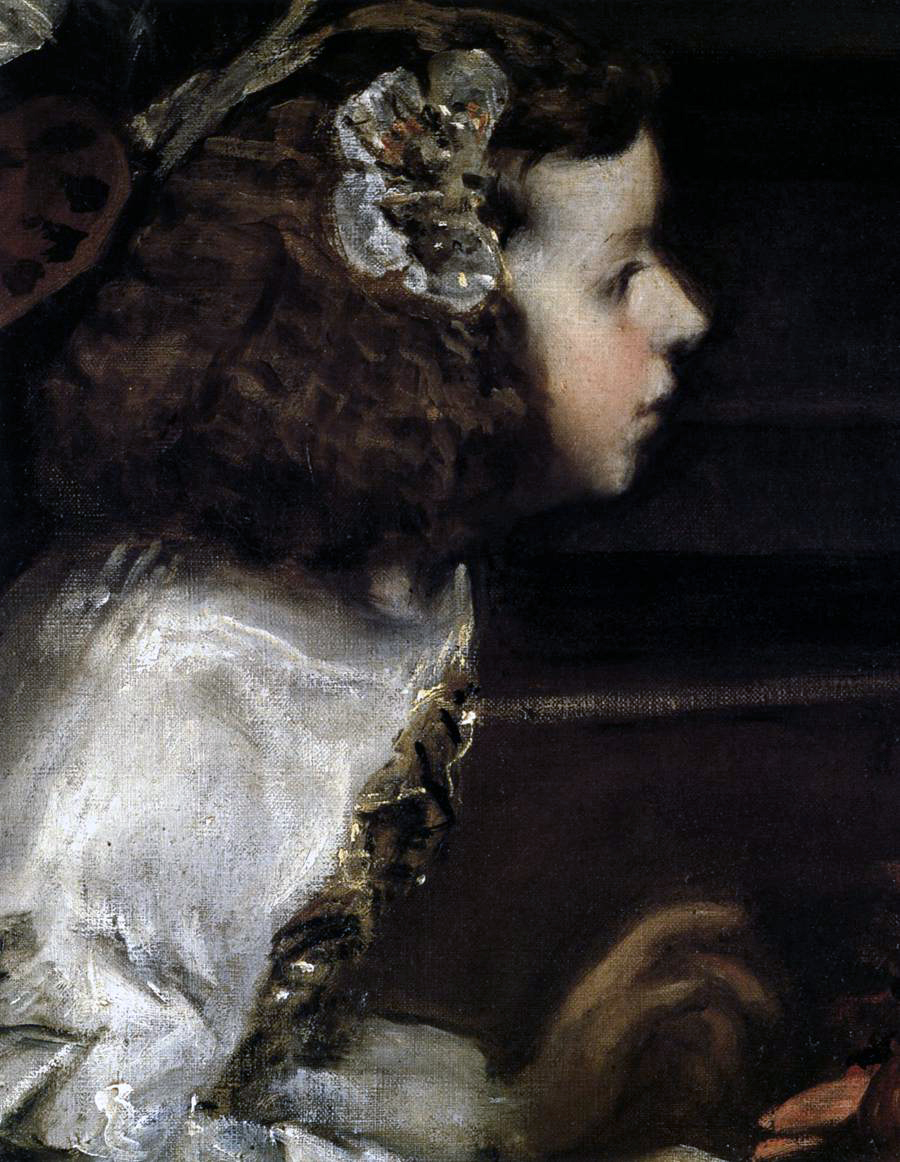 構図 描かれた画面は水平方向に4分割され、垂直方向に7分割されている。このグリッドは複雑な人物配置を整理するために用いられており、当時よく使われた手法 であった[47]。ベラスケスは9人の人物を描いている(王と王妃の反射像を含めれば11人となる)が、それらはキャンバスの下半分にしか配置されていな い。[48] ロペス=レイによれば、この絵画には三つの焦点がある。マリアナ王女、自画像、そしてフィリップ4世とマリアナ王妃の半身像が映る鏡像である。1960年、クラークは構図の成功はまず何よりも光と影の正確な扱いによるものだと指摘した: それぞれの焦点が、新たな一連の関係性へと我々を引き込む。そして『メニーナス』のような複雑な集団を描くには、画家は頭の中で、作品全体に適用できる単 一で一貫した関係性の尺度を保持していなければならない。その実現のために、あらゆる手法、例えば遠近法などを用いることは可能だが、最終的には、完全な 視覚的印象の真実性は、トーンの真実性という一点に依存する。デッサンは簡略で、色彩は単調であっても、トーンの関係が真実であれば、その絵は成立するの だ。[47] しかし、焦点についてはさまざまな議論がある。レオ・スタインバーグによれば、この絵画の直交線は意図的に偽装されており、それによって絵の焦点がずれる という。ロペス・レイと同様に、彼は 3 つの焦点について述べている。しかし、戸口にいる男性が消失点である。より具体的には、彼の腕の曲がり部分が、窓と天井の照明の垂直線が交わる点である。 奥行きと次元は、線遠近法、形の層の重なり、そして特にクラークが述べているように、トーンの使用によって表現されている。この構図的要素は、絵画の中で さまざまな形で機能している。第一に、描かれた部屋とその奥に自然光が差し込む様子だ。中景と前景の絵画空間は二つの光源で照らされている。開いた扉から 差し込む細い光の筋と、右側の窓から注ぐ広い光の流れである。[34] 20世紀のフランス人哲学者・文化批評家ミシェル・フーコーは、窓からの光がアトリエの前景と、その前に描かれていない領域(王、王妃、そして鑑賞者が位 置すると想定される領域)の両方を照らしていると指摘した。[50] ホセ・オルテガ・イ・ガセットによれば、光は場面を三つの明確な部分に分割する。前景と背景の平面は強く照らされ、その中間には暗く影を落とした空間があ り、そこにシルエット状の人物が配置されている。[51] ベラスケスは、この光を用いて各形態に立体感と輪郭を与えるだけでなく、絵画の焦点も定義している。光が右側から差し込むため、光源に最も近い小人役の女 性の編み込みと金髪には明るい光が反射する。しかし彼女の顔は光源から背を向けて影になっているため、その明暗は特に注目すべき点とはならない。同様に、 彼女のそばにいる侍女の頬にも斜めに光が当たるが、顔の輪郭には当たらない。淡い色のドレスの大部分は影に覆われている。しかし王女は、視線は向いていな いものの、顔を光源に向けて完全に照らされている。彼女の顔は淡い絹のような髪に縁取られ、絵の中の他の全てから際立っている。光は彼女の体の立体的な輪 郭を浮き彫りにし、コルセットと硬いボディスに締め上げられた小さな胴体の円錐形を定義する。楕円形のキャンディ箱のように広がるパニエ付きスカートは、 鮮やかな錦織との鋭い対比によって深い影を落とし、その影自体が小さな姿を強調し、注目の主たる点として位置づけている。[52] |