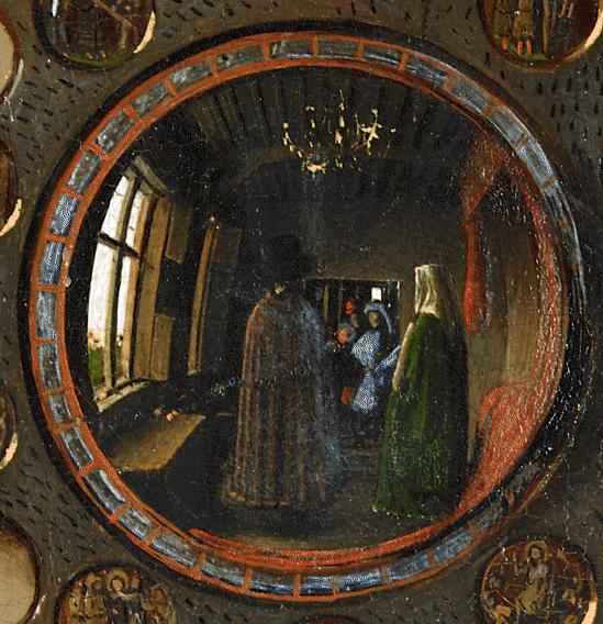 鏡と反射![]() ファン・エイクの『アルノルフィーニの肖像』における鏡の細部。ファン・エイクの絵画は「背後」から見た絵画空間を描き、さらに画面空間の前方に二つの人物像を配置している。これは『ラス・メニーナス』の鏡に映る反射像の人物たちと同様である。 鏡の反射が映し出す空間構造と位置関係は、フィリップ4世とマリアナが絵画空間の鑑賞者側に立ち、インファンタとその随行者たちに向き合っているように見 える。ヤンソンによれば、前景に人物が集まっているのはフィリップとマリアナのためであるだけでなく、画家の注意が夫妻に集中していることを示している。 画家は夫妻の肖像画を描いているように見えるのだ。[38] 鏡像にしか映らないにもかかわらず、彼らの遠景像は社会的階層と構図の両面でキャンバスの中央を占めている。鑑賞者としての観者の絵画に対する位置関係は 不確かだ。統治者夫妻が観者の傍らに立っているのか、それとも観者に取って代わり、彼らの目を通して情景を見ているのかは議論の的となっている。後者の説 を裏付けるのが、ベラスケス、王女、マリバルボラの三人の視線だ。彼らは鑑賞者をまっすぐに見ているように見える。[57] 後壁の鏡は、そこに存在しないものを示している。王と王妃、そしてハリエット・ストーンの言葉を借りれば「絵画の前に立つ夫婦の立場を引き継ぐ、幾世代もの鑑賞者たち」である。[31] 1980年に批評家スナイダーとコーンはこう記している: ベラスケスは鏡の映像を、使用可能な[原文ママ]描かれたキャンバスに依存させたかった。なぜそうしたのか?鏡に映る輝かしい映像は王と王妃自身を反映し ているように見えるが、それだけではない:鏡は自然を超越する。鏡像は単なる反射に過ぎない。何を映すのか?真実の姿を――ベラスケスの芸術そのものを。 神聖なる君主たちの御前で…ベラスケスは自らの芸術的技量に誇りを抱き、フェリペとマリアにこう助言する。鏡という自然の反射に自らの姿を求めず、むしろ 巨匠画家の鋭い視線の中に真実を見出せと。ベラスケスの御前において、鏡像は真実の貧弱な模倣に過ぎないのだ。[58] ![]() 『アルノルフィーニの肖像』(1434年)において、ヤン・ファン・エイクは鏡に映る像を、ベラスケスの『ラス・メニーナス』と同様の手法で用いている。[17] 『ラス・メニーナス』では、王と王妃は本来「絵画の外」にいるはずだが、後壁の鏡に映る彼らの姿は同時に彼らを「絵画空間の内側」にも位置づけている。 [59] スナイダーは、この絵画が「威厳の鏡」あるいは君主のための鏡への言及であると提案する。王と王妃の文字通りの反射である一方で、スナイダーは「それは模 範的な君主たちの像であり、理想的な性格の反映である」と記している。[60] その後彼は王女に焦点を当て、ベラスケスの肖像画は「王女の教育のための手引書の絵画的対応物―王女の鏡である」と書いている。[61] この絵画は、1434年のヤン・ファン・エイク作『アルノルフィーニの肖像』の影響を受けている可能性が高い。当時、ファン・エイクの作品はフェリペ王の 宮殿に掛けられており、ベラスケスも目にしたはずだ。[17][62] 『アルノルフィーニの肖像』でも、絵画空間の奥に鏡が配置され、ベラスケスの絵画の鑑賞者と同じ視角を持つ二人が映っている。彼らは小さすぎて特定できな いが、一人は画家自身を意図した可能性があると推測されている。ただし、彼は絵を描いている姿は描かれていない。ルシアン・ダレンバッハによれば: 『ラス・メニーナス』の鏡はファン・エイクの絵画と同様に鑑賞者に向いている。しかしここでは手法がより現実的だ。王室夫妻が映る「後方視鏡」が凸面では なく平面になった点で。フランドル絵画の反射像が鏡の曲率によって圧縮・変形された空間内で物体や人物を再構成したのに対し、ベラスケスの反射像は遠近法 の法則を弄ぶことを拒む。絵画の前に立つ国王と王妃の完全な複製像をキャンバスに投影しているのだ。[37] |