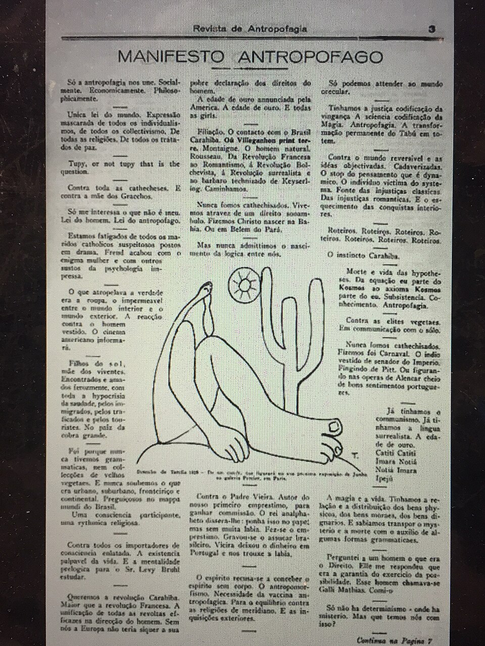 ![]() Publicação original do "Manifesto Antropófago" na Revista de Antropofagia de Oswald de Andrade em 1928. A imagem ao centro é um desenho de contorno da artista brasileira Tarsila do Amaral de sua pintura de 1928 "Abaporu". 1928年にオズワルド・デ・アンドラーデが『人食いの雑誌』に発表した「人食いのマニフェスト」のオリジナル版。中央の画像は、ブラジル人アーティスト、タルシーラ・ド・アマラルが1928年に描いた絵画「アバポル」の輪郭画だ。 |