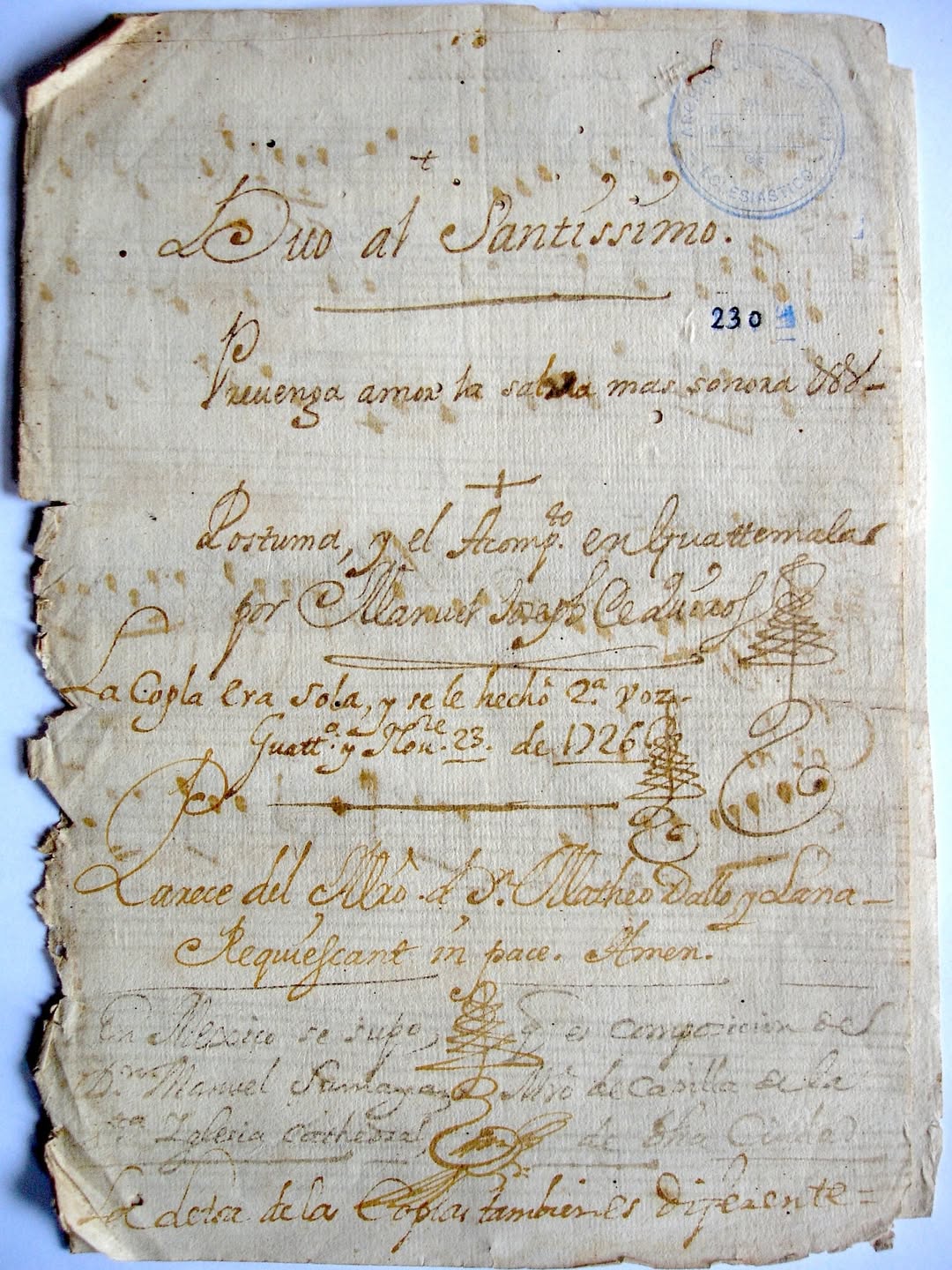 disfrazas」の場合、彼自身が通奏低音パートを演奏した「ロゼッタ・ストーン」を残している。楽譜の同じページに2つの写しがあることもある。も