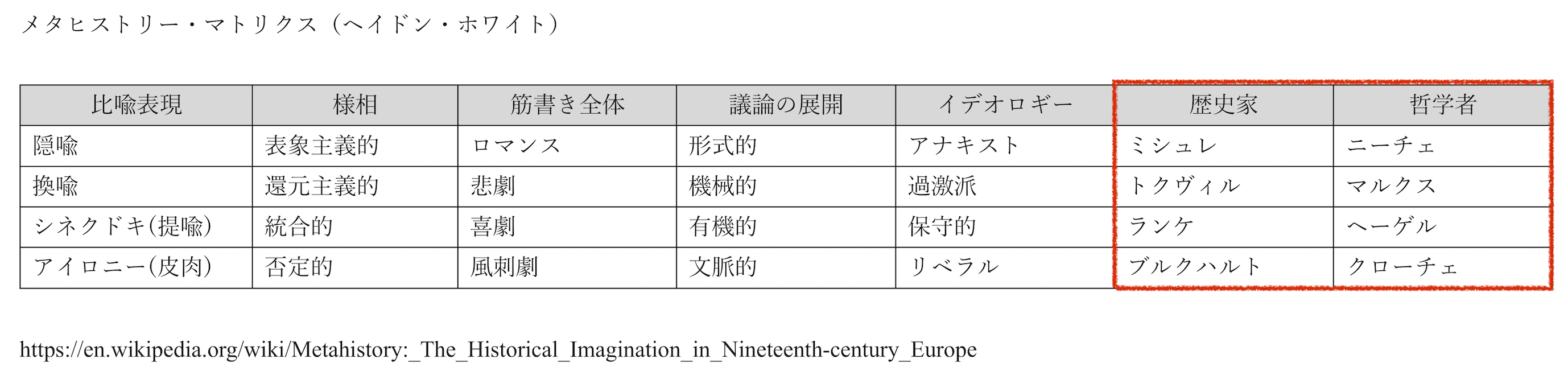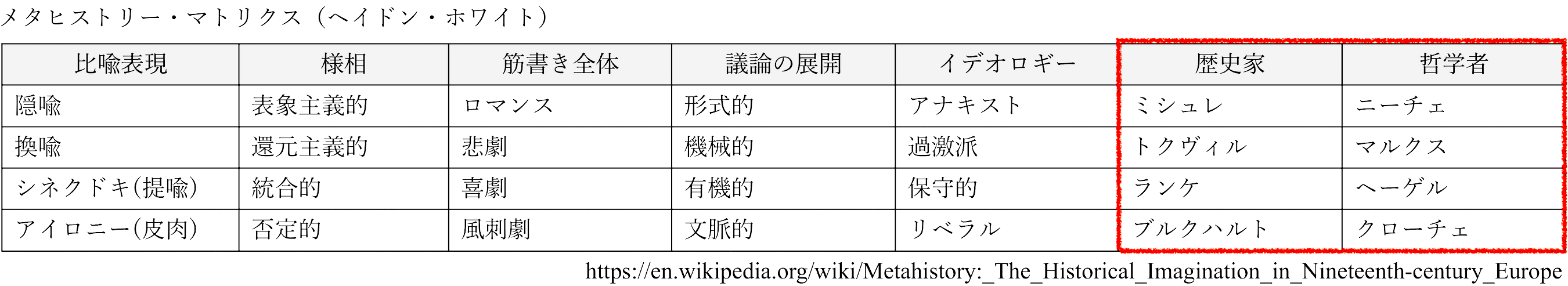 が採用した初期の分類に言及し、隠喩と皮肉を対比させている[4]。 ホワイトが選んだ例示的人物は、歴史家と哲学者の理想型を提示している。 |