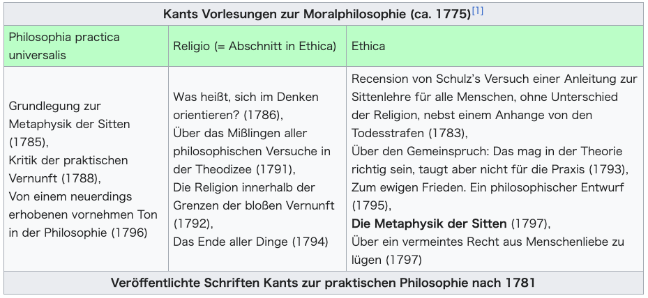 ![]() Kants Vorlesungen zur Moralphilosophie (ca. 1775)[1] Philosophia practica universalis Religio (= Abschnitt in Ethica) Ethica +++ Grundlegung zur Metaphysik der Sitten (1785), Kritik der praktischen Vernunft (1788), Von einem neuerdings erhobenen vornehmen Ton in der Philosophie (1796) ++++ Was heißt, sich im Denken orientieren? (1786), Über das Mißlingen aller philosophischen Versuche in der Theodizee (1791), Die Religion innerhalb der Grenzen der bloßen Vernunft (1792), Das Ende aller Dinge (1794) +++ Recension von Schulz’s Versuch einer Anleitung zur Sittenlehre für alle Menschen, ohne Unterschied der Religion, nebst einem Anhange von den Todesstrafen (1783), Über den Gemeinspruch: Das mag in der Theorie richtig sein, taugt aber nicht für die Praxis (1793), Zum ewigen Frieden. Ein philosophischer Entwurf (1795), Die Metaphysik der Sitten (1797), Über ein vermeintes Recht aus Menschenliebe zu lügen (1797) +++ Veröffentlichte Schriften Kants zur praktischen Philosophie nach 1781  |