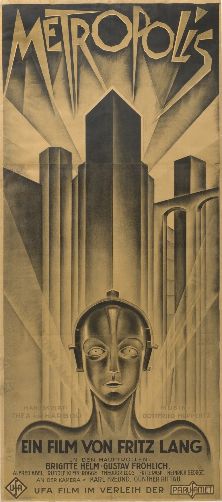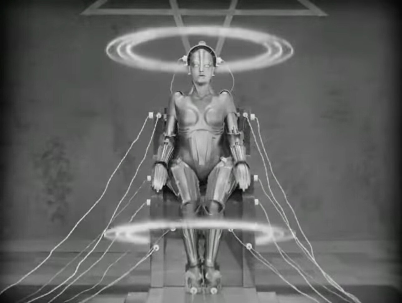 参考文献 情報注記 映画のオープニングクレジットでは、いくつかの役柄が俳優名なしでキャストリストに載っている:創造者、機械人間、死、そして七つの大罪である。これらの 役柄は、ブリジット・ヘルムのクレジットの直上に表示されるため、誤って彼女に帰属させられることがある。しかし制作中のスチール写真が示すように、ブリ ジット・ヘルムは実際に機械人間の役を演じており、ロボットの衣装の中にいる彼女の姿が確認できる。[15] § 65 共作者、映画作品、歌詞付き音楽作品 (2) 映画作品及びこれに類する作品については、著作権は、以下の人格のうち最後に生存した者の死後70年で消滅する:主任監督、脚本作者、台詞作者、映画音楽 の作曲者。[113] このドイツ法で考慮される人物は、監督フリッツ・ラング(1976年没)、脚本家テア・フォン・ハルボウ(1954年没)、そしておそらく作曲家ゴットフ リート・フッパーツ(1937年没)である。  |