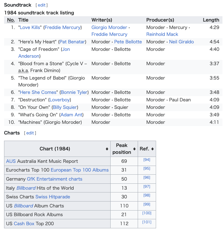 ポピュラー・カルチャーにおける言及 以下は、この映画がポピュラー・カルチャーで言及された事例である: デヴィッド・ボウイの1974年アルバム『ダイヤモンド・ドッグス』とその後のツアーは、この映画に触発されたものである。アマンダ・リアはこう回想して いる。「彼はこの映画を借りて、自宅で何度も繰り返し観たんだ。それで『ダイヤモンド・ドッグス』が生まれたんだ――ステージングもアルバムも全て、ボウ イは『メトロポリス』から得たものなんだ」。[120] 1970年代の英国ロックバンド、ビー・バップ・デラックスの1977年アルバム『Live! In the Air Age』のジャケットは、本作の静止画である。[121] ドイツの電子音楽グループ、クラフトワークの1978年アルバム『ザ・マン・マシン』には「メトロポリス」という曲が含まれている。[出典が必要] ロックバンド、モーターヘッドのアルバム『オーバーキル』には「メトロポリス」という曲が含まれている。この曲は、バンドのリードシンガー兼ベーシストで あるレミーが1979年にこの映画を観た後に書いたものだ。アルバムの収録時間が不足していたため、その隙間を埋めるために書かれた。[122] 『スター・ウォーズ』のC-3POキャラクターをデザインする際、ラルフ・マクォーリーはマシーネンメンシュの美学に触発された。両者は驚くほど似通って いる。[123] クイーンが1984年に発表した楽曲「ラジオ・ガガ」のミュージックビデオでは、本作の映像やクリップが使用されている。[124]バンドメンバー4人が 映像に挿入されており、例えばフレディ・マーキュリーの顔がロボットの顔に一瞬重ねられる場面がある。ビデオの最後には「メトロポリスに感謝」というキャ プションが表示される。マーキュリーは、モローダー版映画のサウンドトラックに「Love Kills」という曲を提供し、この曲で最悪のオリジナルソング部門のゴールデンラズベリー賞にノミネートされた。[125] マドンナの1989年のミュージックビデオ「Express Yourself」は、この映画とフリッツ・ラングに敬意を表している。[126] ハダウェイの1993年のミュージックビデオ「Life」は、この映画に触発されたものである。2021年5月、デイヴィッド・J・マローニーの「The Weekly Show」でのオンラインインタビューで、ハダウェイは、このビデオのアイデアは、映画の一部のクリップを含むクイーンの「Radio Ga Ga」のビデオを見た後に、自分自身が思いついたものだと語った。[127] ホイットニー・ヒューストンの1994年のミュージックビデオ「Queen of the Night」も、ラングの映画に敬意を表している。ヒューストンは、マリア・ロボットに触発された金属製の衣装を着ている。同様に、1992年の大ヒット 作『ボディガード』も、この映画からのクリップを使用している。ヒューストンがナイトクラブでこの歌を歌っている場面で、それらが背景のマルチスクリーン に映し出されている。[128] 1996年のDCコミックスのグラフィックノベル『スーパーマンズ・メトロポリス』は、エルスワールドズの一編であり、スーパーマンをフリッツ・ラングの 『メトロポリス』の世界に配置している。[129] 1998年、アメリカのニューメタルバンド、システム・オブ・ア・ダウンは「シュガー」というミュージックビデオをリリースした。このビデオには『メトロ ポリス』の映像が使用されている。[130] ジャネル・モネイは、2007年半ばにリリースしたEP『メトロポリス:スイートI(ザ・チェイス)』と、2009年リリース『ザ・アーチアンドロイド』 の両コンセプトアルバムを、オリジナル映画に基づいて制作した。後者のアルバムカバーには『メトロポリス』へのオマージュが込められており、バベルの塔の 映画版が都市の残骸の中に描かれている。これらのアルバムは、モネの分身でありロボットであるシンディ・メイウェザーが、メトロポリスのアンドロイド社会 における救世主的存在として活躍する物語を追っている。[131] [132] レディー・ガガは自身の楽曲のミュージックビデオで、ラングの映画への言及を繰り返し行っている。特に顕著なのは「アレハンドロ」(2010年)、「ボー ン・ディス・ウェイ」(2011年)、「アプローズ」(2013年)のミュージックビデオにおける視覚的引用である。[133] ビヨンセもまた、ラングの映画への一連の言及を行い、マシーネンメンシュに着想を得た衣装を着用している。まず2007年のBETアワードでのパフォーマ ンスで、その後2023年のルネッサンス・ワールド・ツアーおよび同ツアーのドキュメンタリー・コンサート映画『ルネッサンス:ビヨンセによる映画』で披 露された。[134] エレクトロニック・ミュージック・トリオ、ザ・エム・マシーンによる2012年のEP『メトロポリス・パートI』は、この映画に着想を得たコンセプト作品 である。[135] ブラジルのメタルバンド、セパルトゥーラは2013年のアルバム『The Mediator Between Head and Hands Must Be the Heart』のタイトルを、本作の台詞に因んで付けた。[136] グラフィックノベル『リーグ・