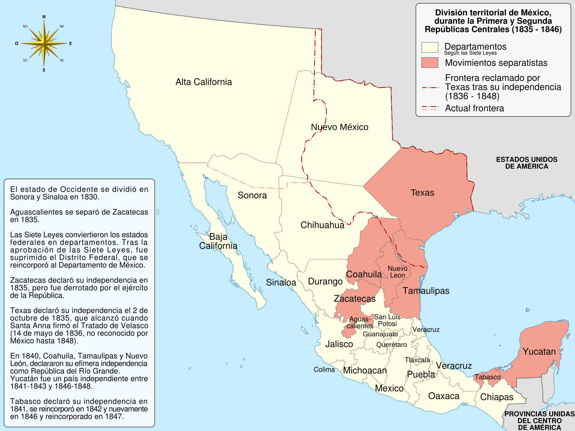 右)中央共和国時代のメキシコの領土組織。赤色で示されているのは分離主義地域である