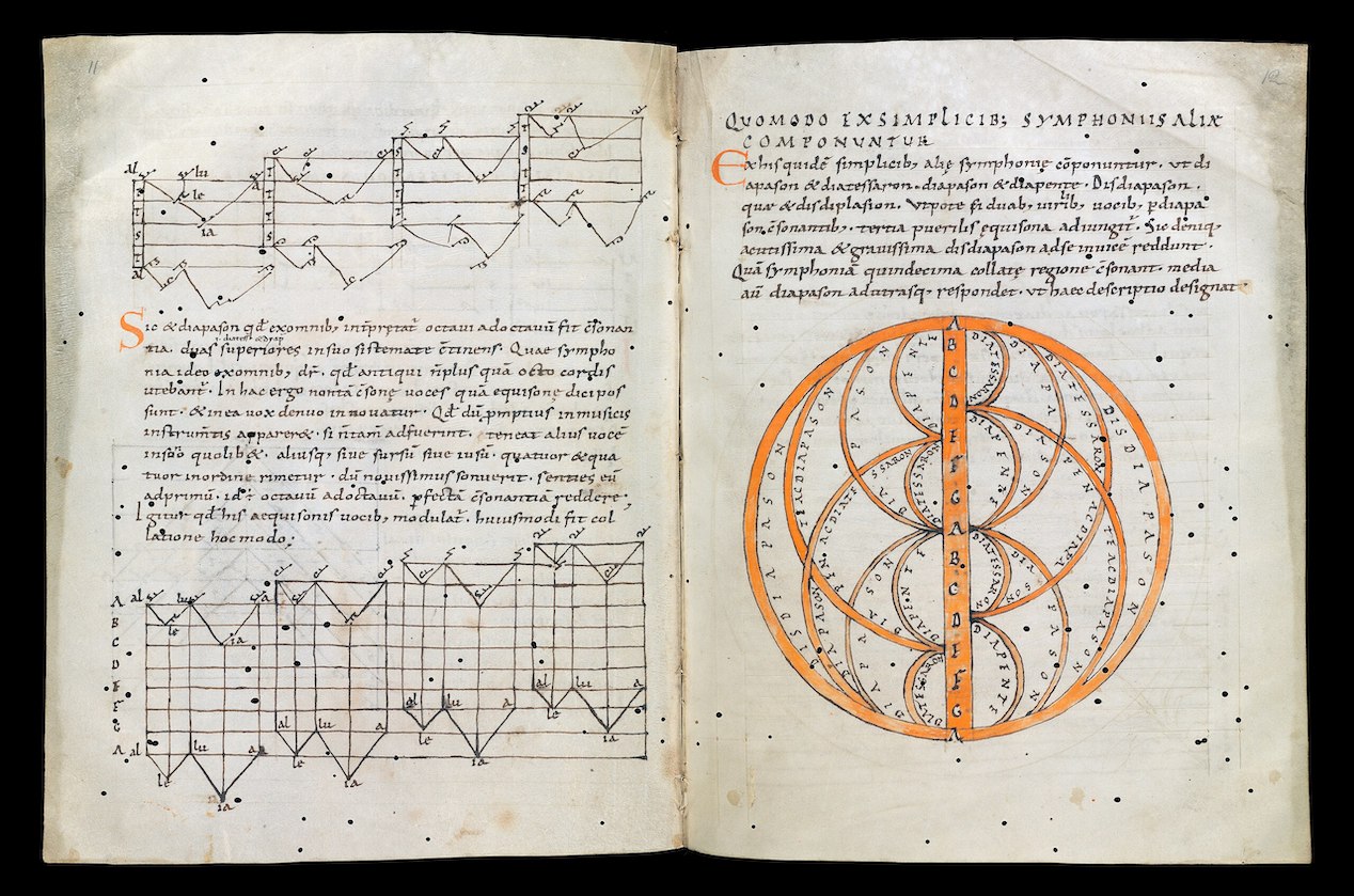 それが構築される基本的な素材を出発点とするという点で、音楽分析とは異なる」[1]。 音楽理論は、音楽家や作曲家がどのように音楽を作るかを説明することに関心がある。音楽を構成するものの概念が拡大し続けているため、より包括的な定義 は、静寂を含むあらゆる音の現象を考慮することである。しかし、これは絶対的なガイドラインではない。例えば、中世ヨーロッパで一般的であったクアドリ ヴィウム教養大学のカリキュラムにおける「音楽」の研究は、実際の音楽的実践から距離を置いて注意深く研究された比率の抽象的なシステムであった[n 1]。しかし、この中世の学問は、後の世紀における調律システムの基礎となり、音楽理論の歴史に関する現代の学問に一般的に含まれている[n 2]。 実践的な学問としての音楽理論は、作曲家やその他の音楽家が音楽を創作・演奏する際に用いる手法や概念を包含している。この意味での音楽理論の発展、保 存、伝達は、口承や文字による音楽制作の伝統、楽器、その他の遺物の中に見出すことができる。例えば、世界中の先史時代の遺跡から出土した古楽器からは、 その楽器から生み出された音楽の詳細や、製作者が使用していたであろう音楽理論が明らかになる可能性がある。世界中の古代文化や現存する文化において、音 楽理論の深く長いルーツは、楽器や口承伝承、現在の音楽制作の中に見ることができる。また、多くの文化では、書かれた論文や楽譜など、より正式な方法で音 楽理論を考察してきた。実践的な伝統と学術的な伝統は重なり合っており、音楽に関する多くの実践的な論考は、他の論考の伝統の中に位置づけられ、学術的な 文章が以前の研究を引用するのと同じように、定期的に引用されている。 現代の学術界では、音楽理論は音楽学の一分野であり、音楽文化や音楽史に関する広範な学問である。音楽理論は、調律や音律体系、音階、協和音と不協和音、 リズム関係など、抽象的な音楽的側面に関わることが多い。また、音楽の創作や演奏、オーケストレーション、装飾、即興演奏、電子音響制作など、実践的な側 面に関する理論も存在する[3]。アメリカやカナダの大学でテニュアトラックの音楽理論家として教えるためには、通常、修士号または博士号レベルの大学で の研究が必要である。分析の方法としては、数学、図形分析、特に西洋楽譜による分析があります。比較法、記述法、統計法、その他の方法も用いられます。音 楽理論の教科書には、特にアメリカでは、音楽音響学の要素、楽譜の考察、調性構成の技法(和声と対位法)などが含まれていることが多い。 |